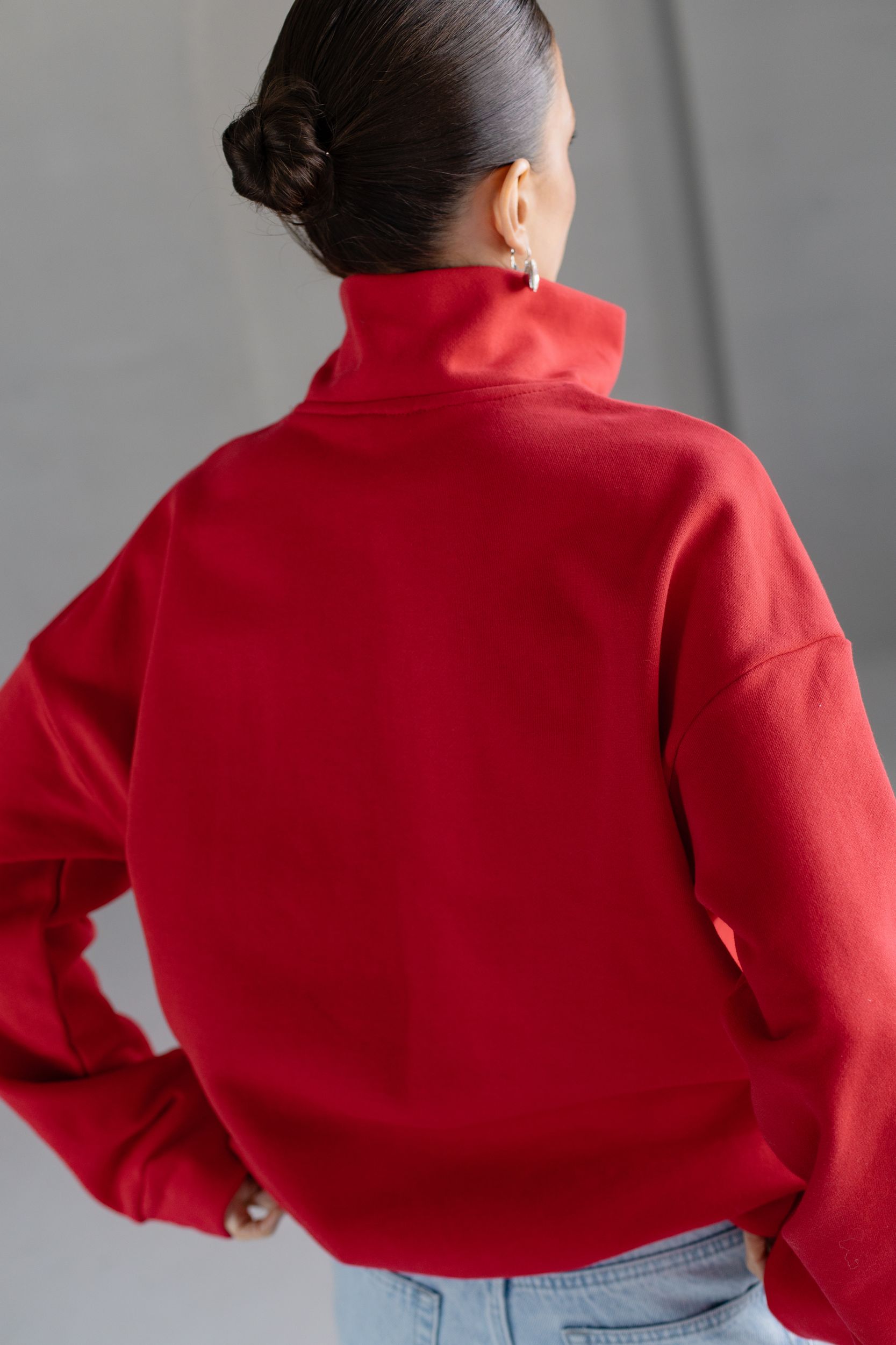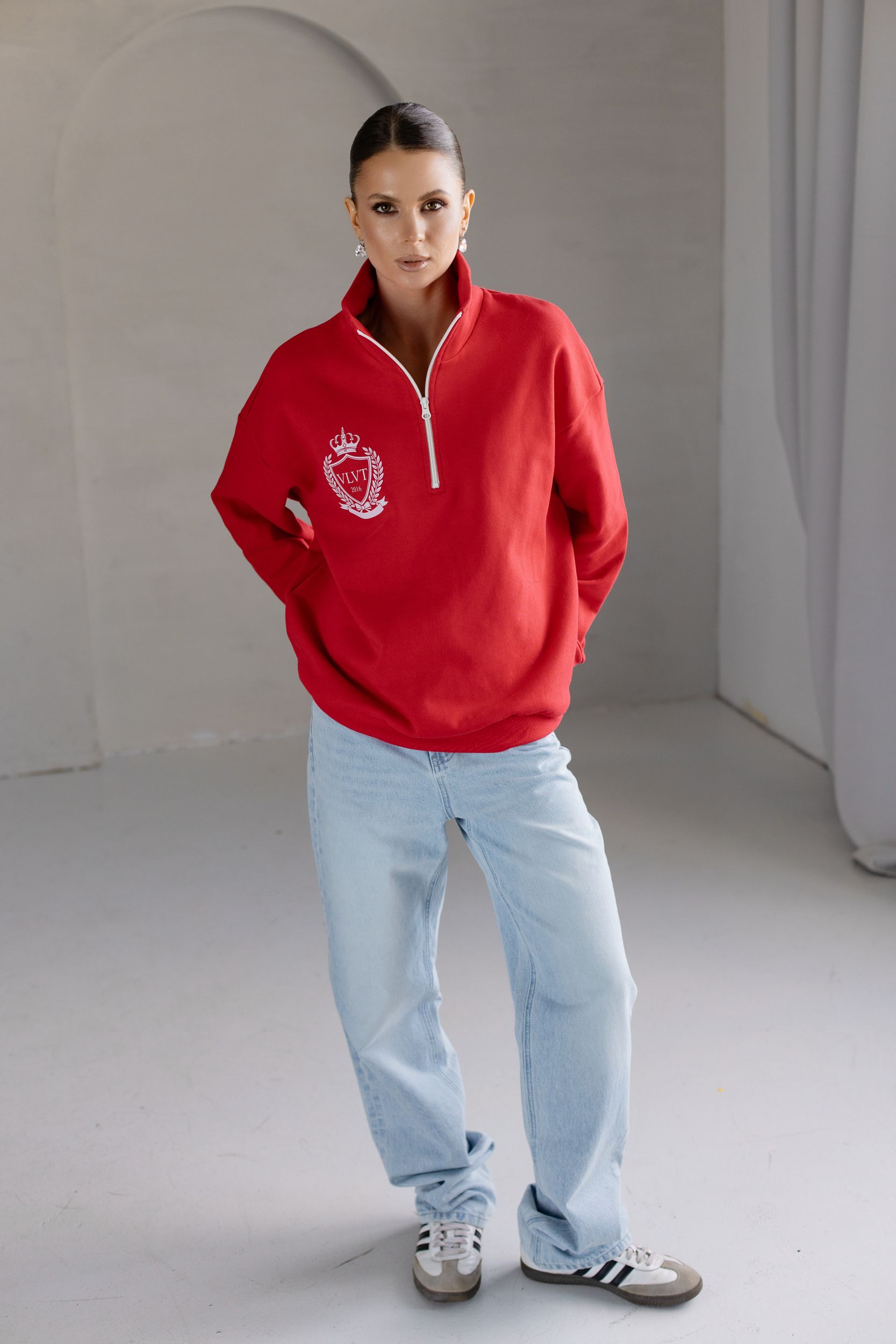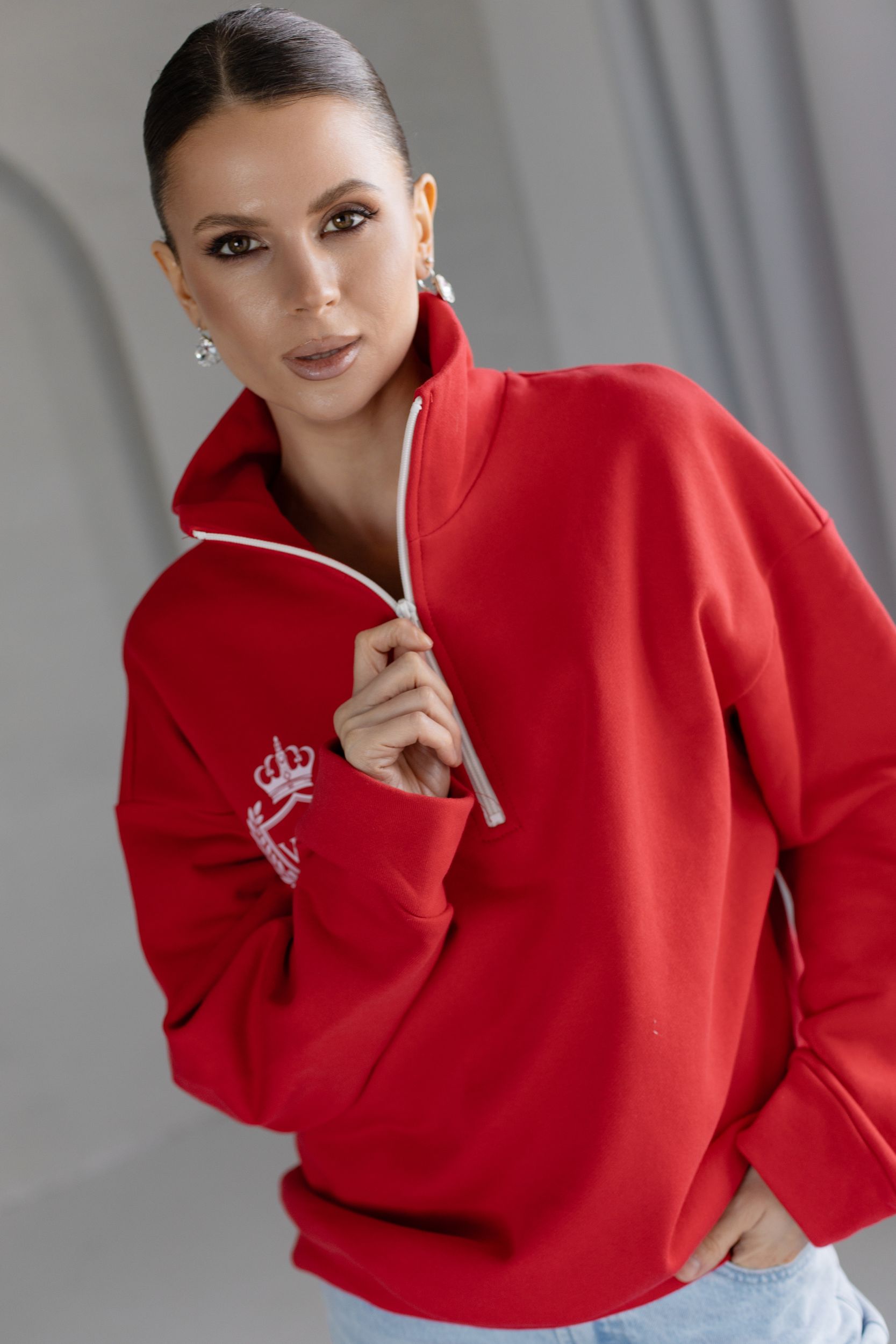 Анорак из трикотажа в красном оттенке с контрастной молнией и принтом.