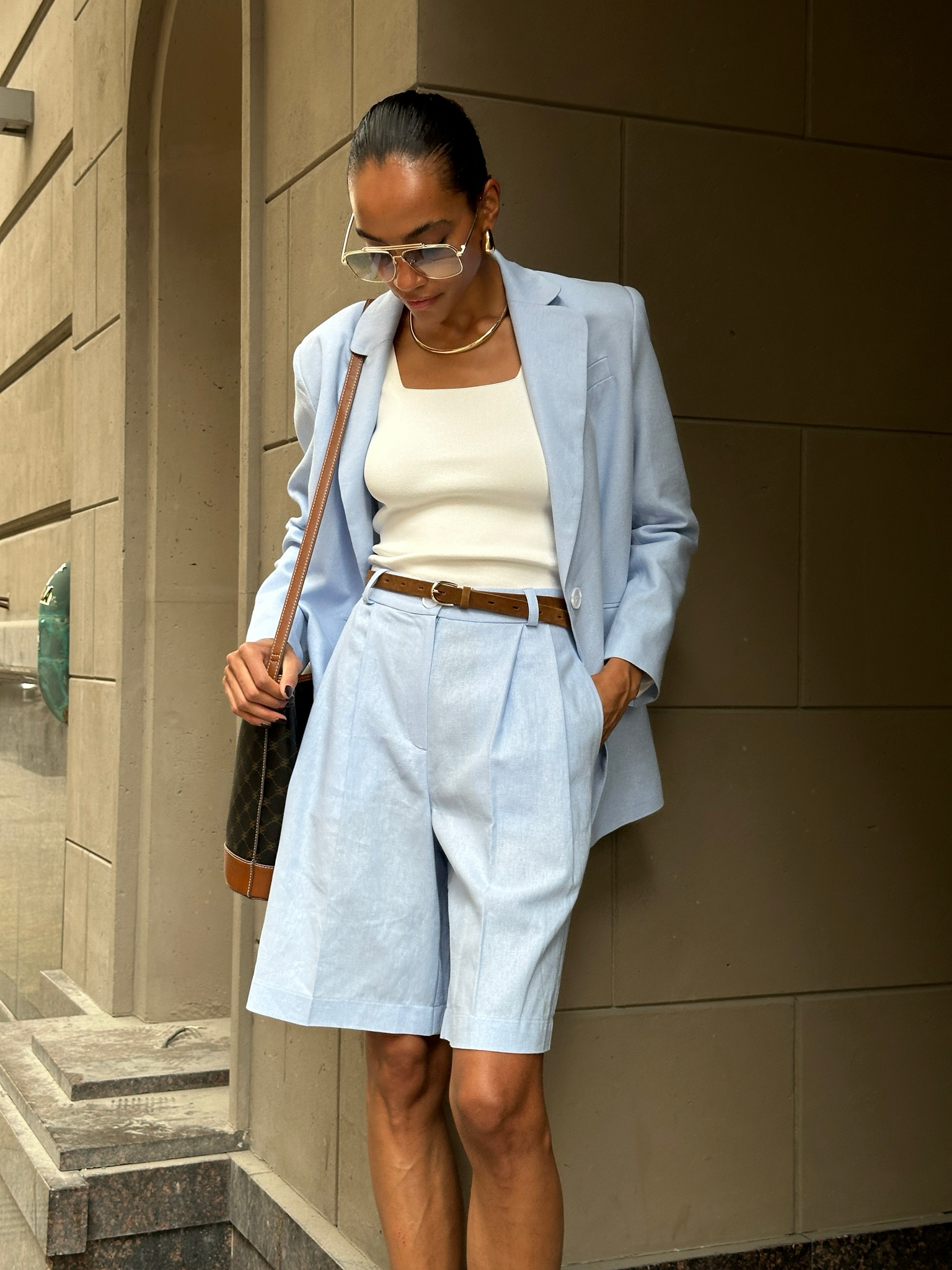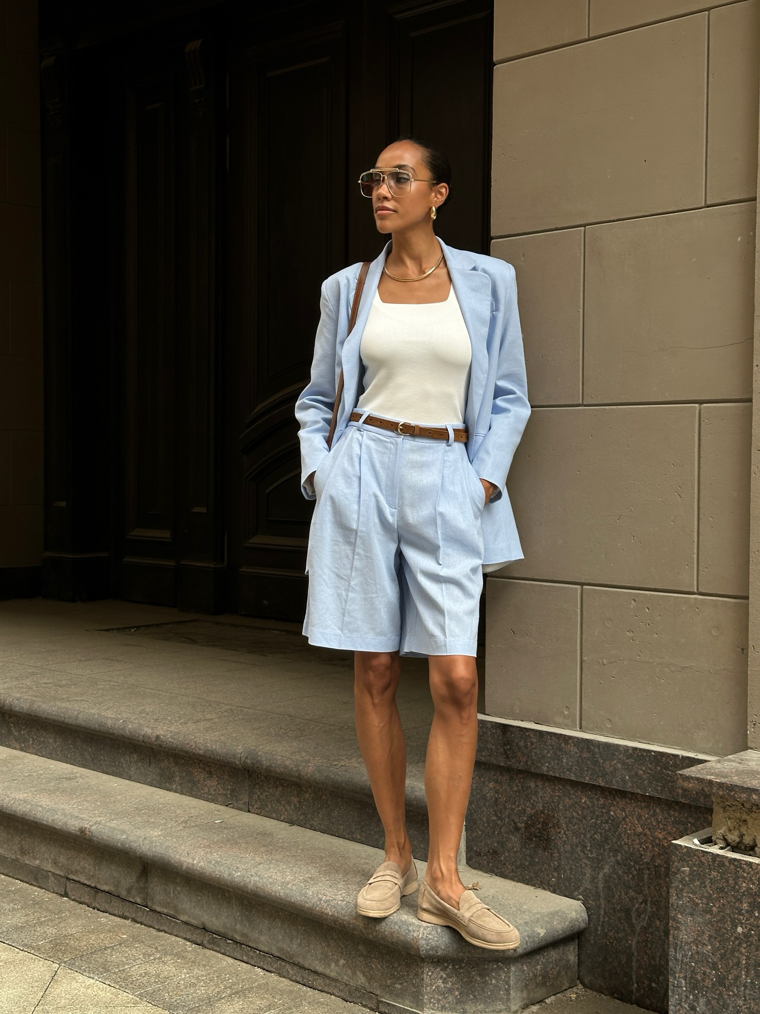 Классические шорты-бермуды изо льна голубого оттенка на завышенной талии станут незаменимым элементом вашего летнего гардероба.
