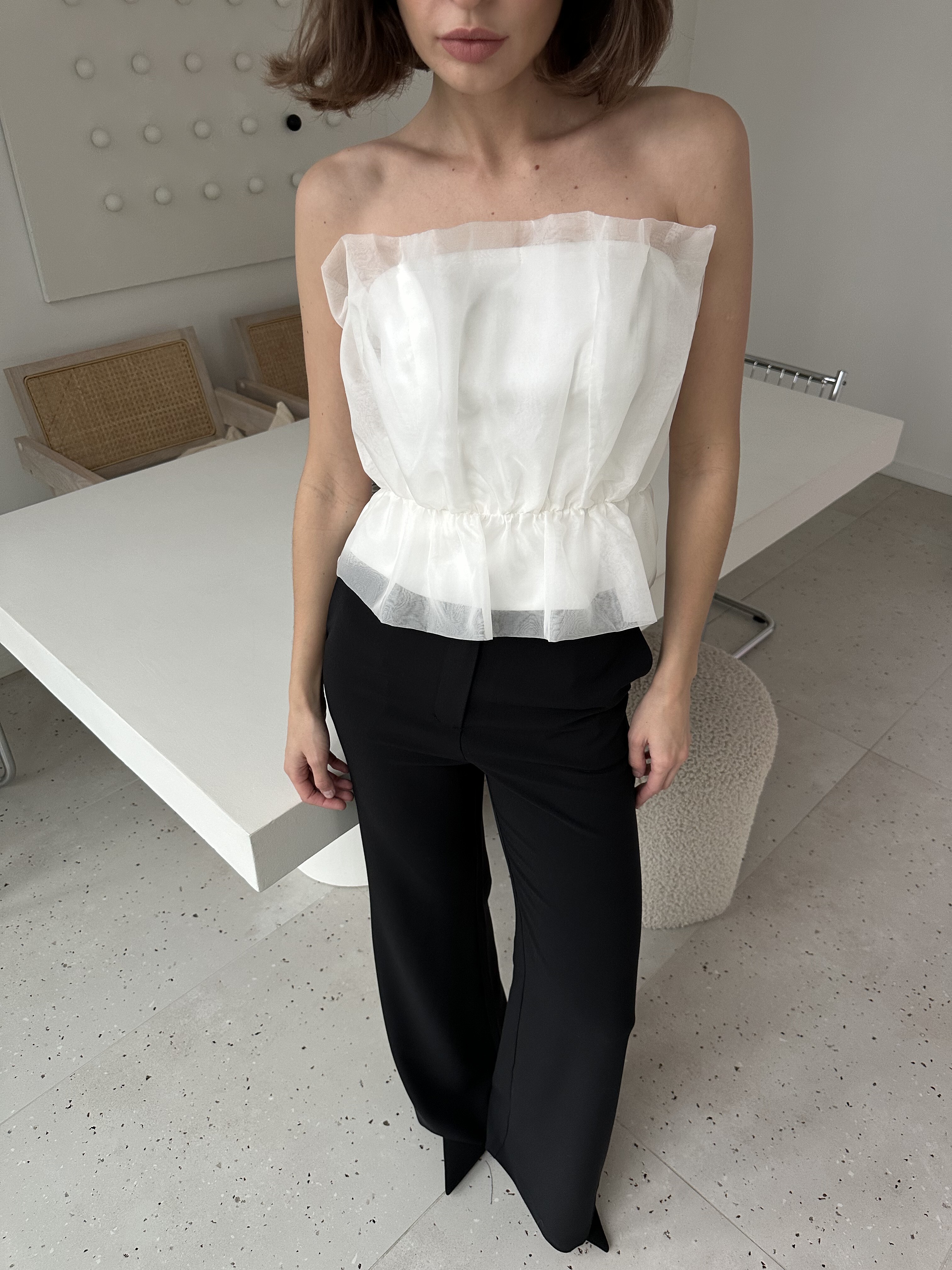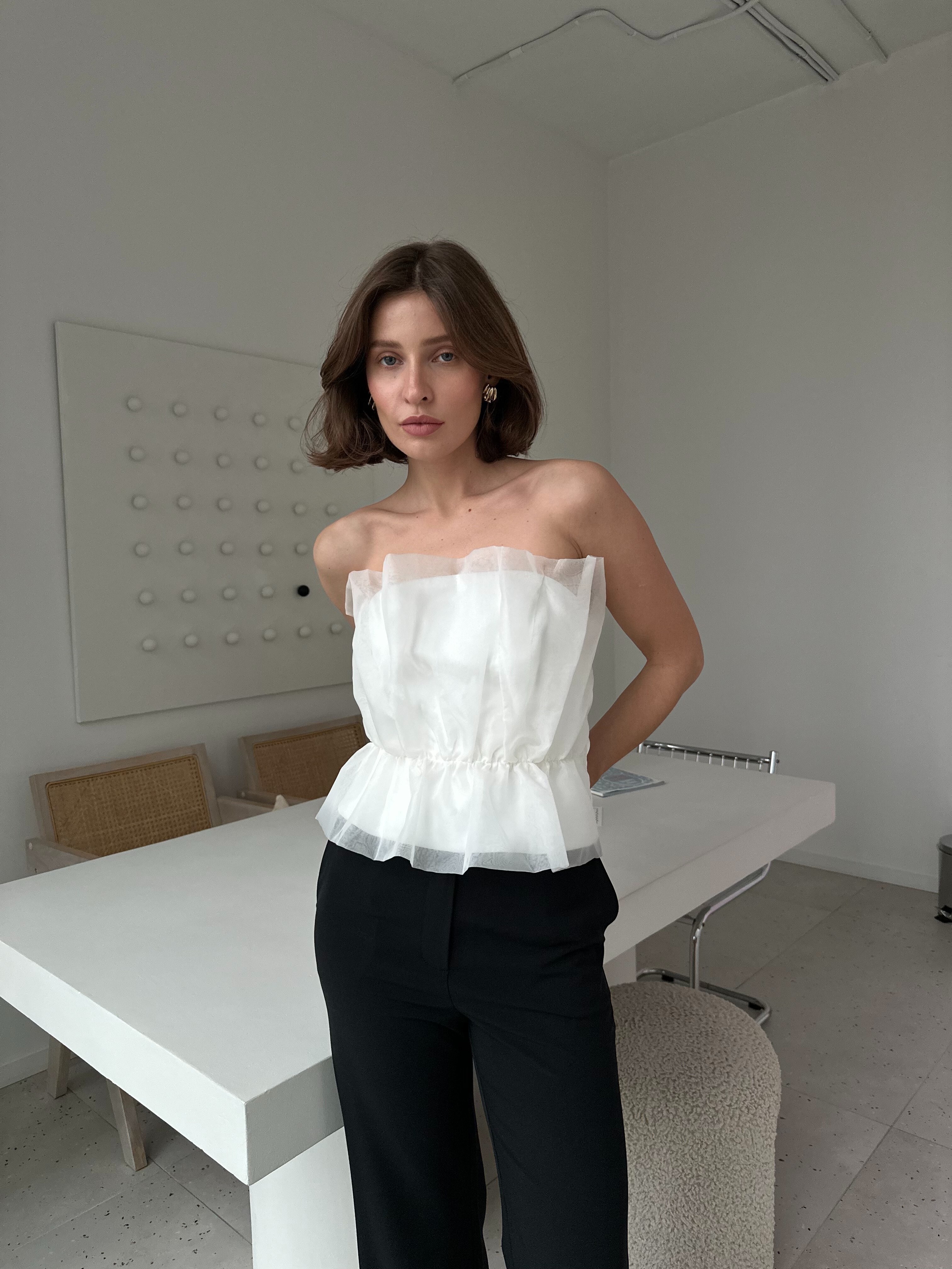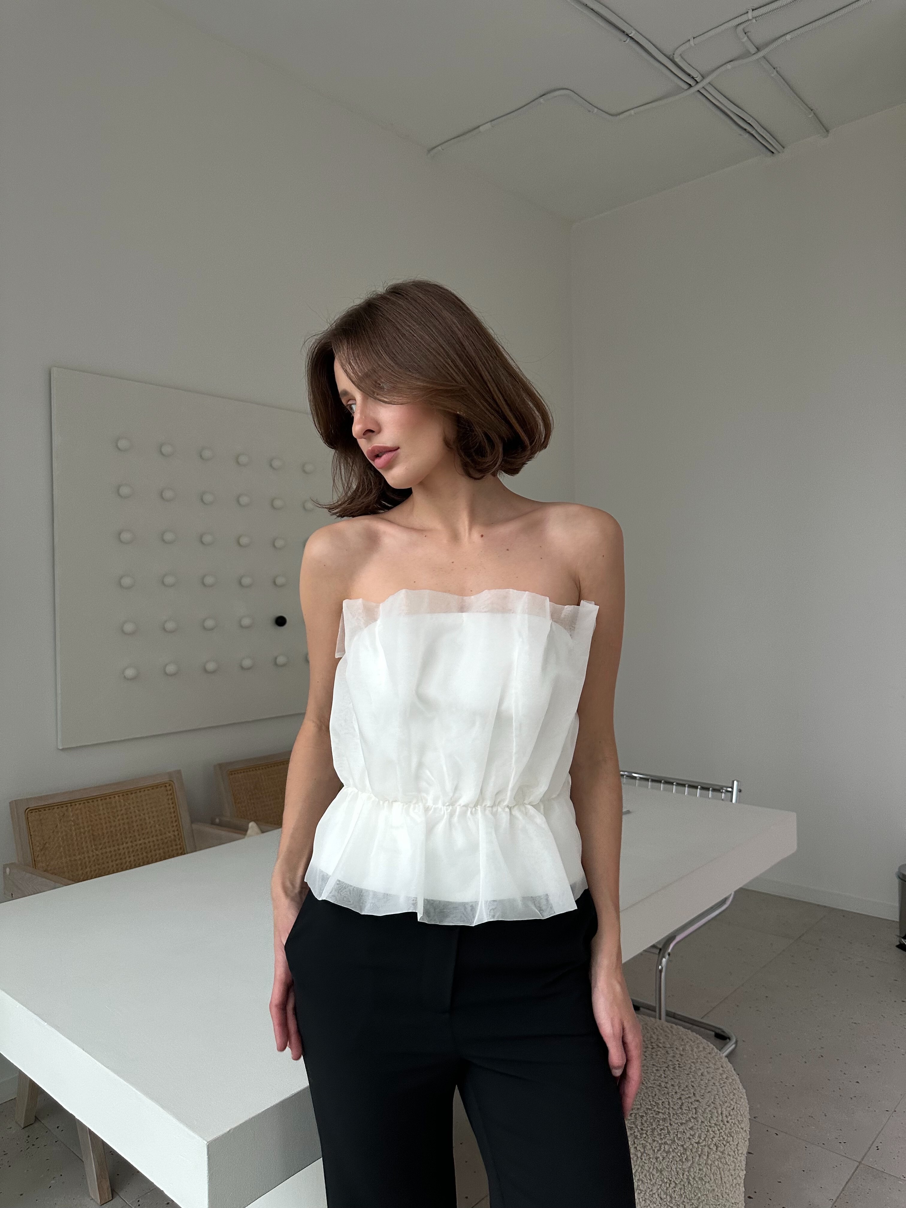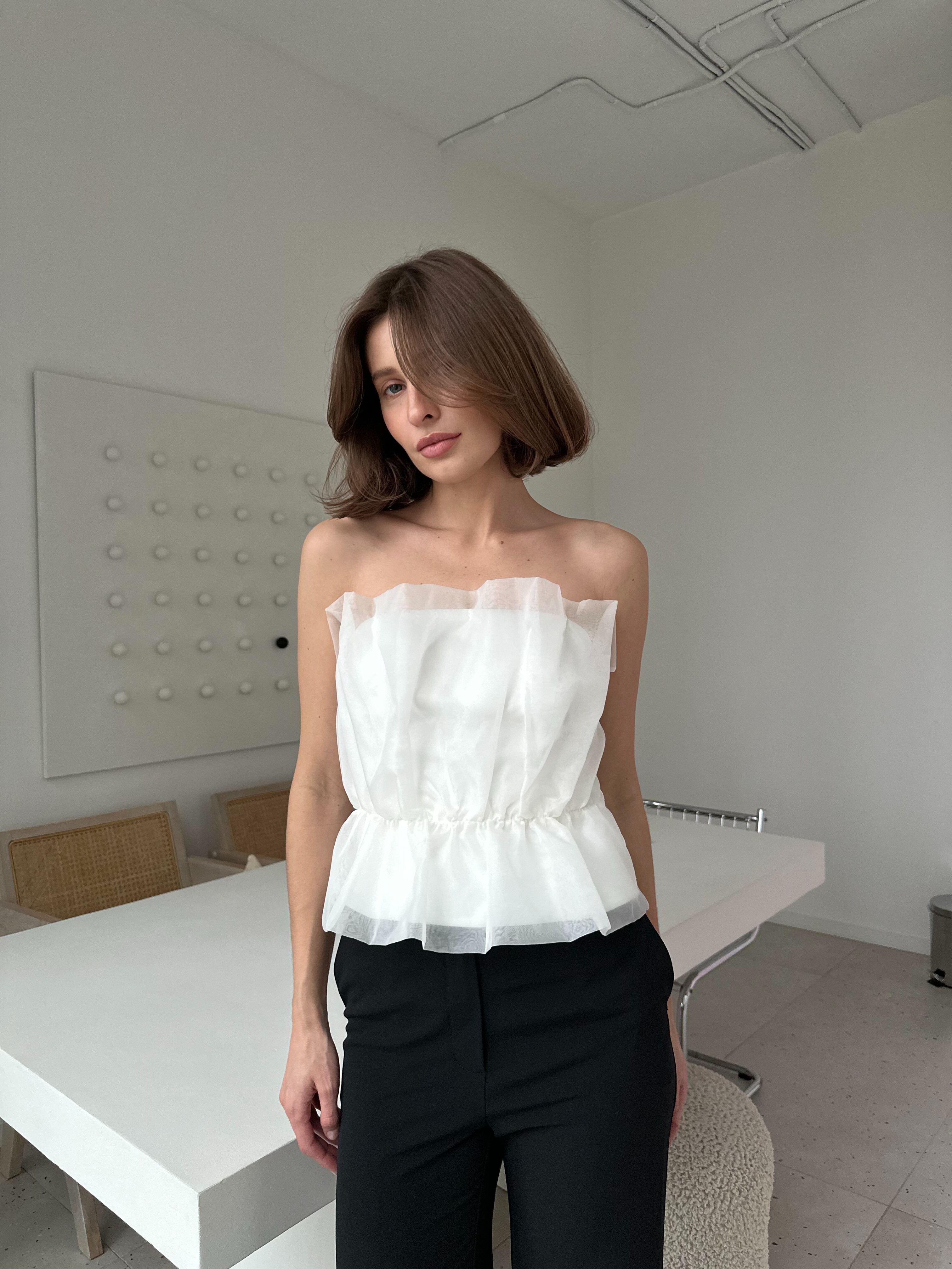 Топ с декоративной драпировкой из органзы в молочном оттенке.