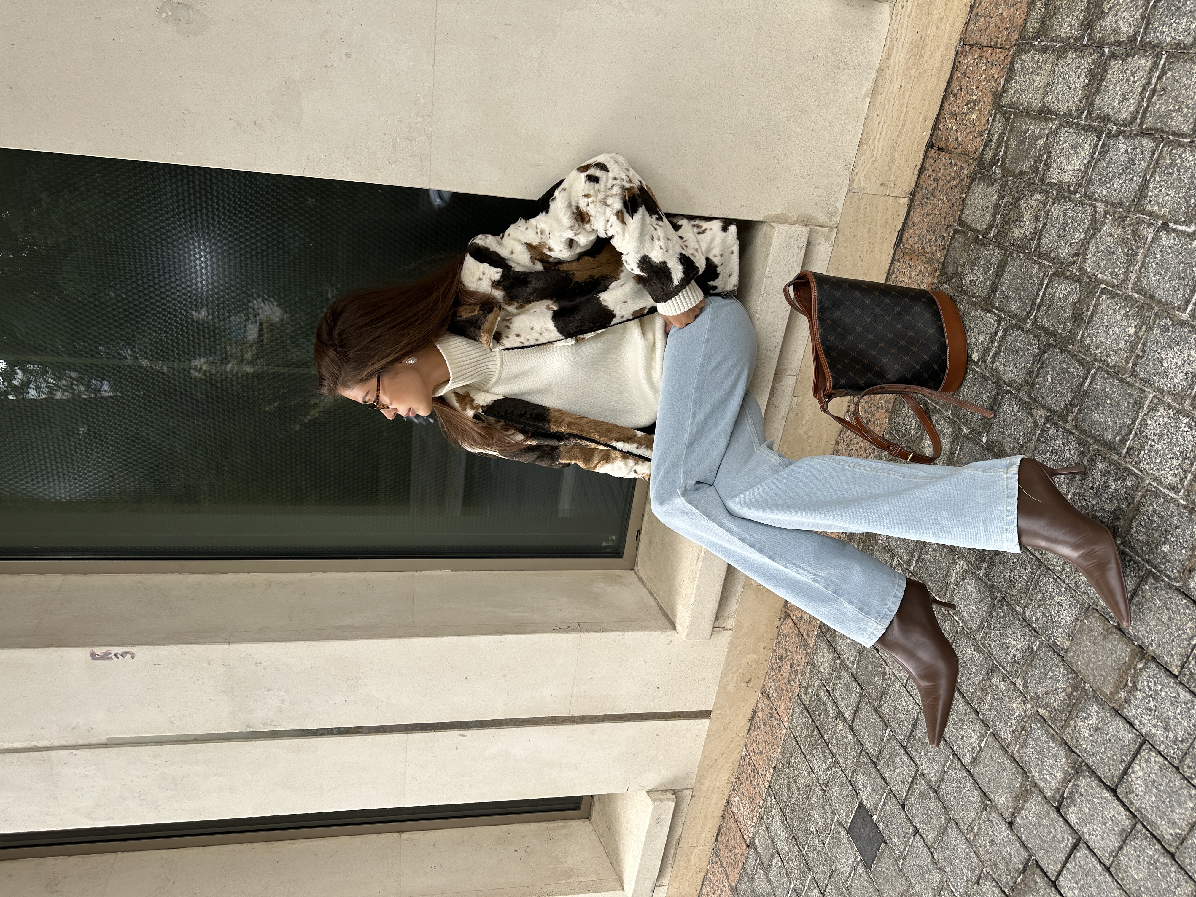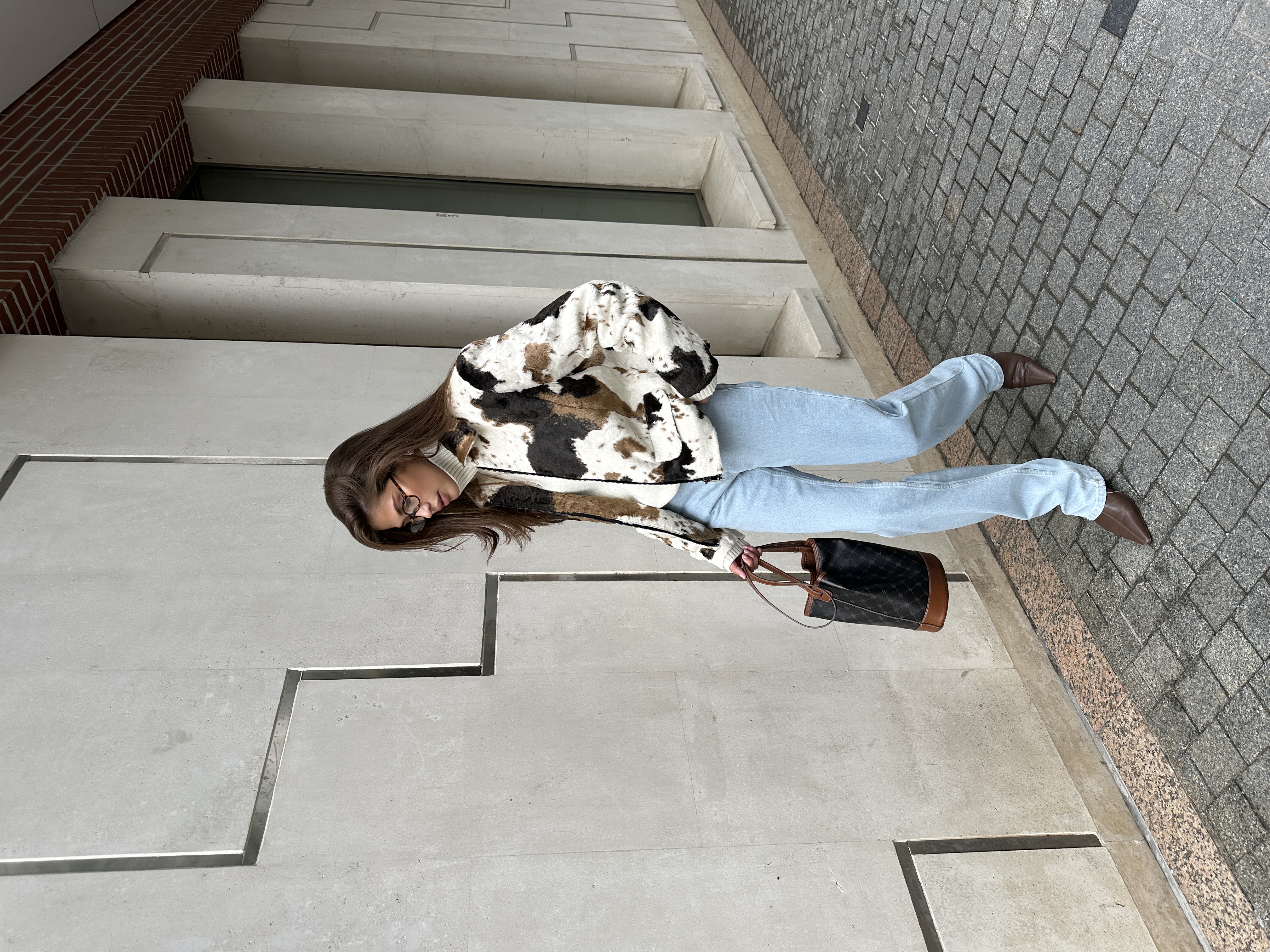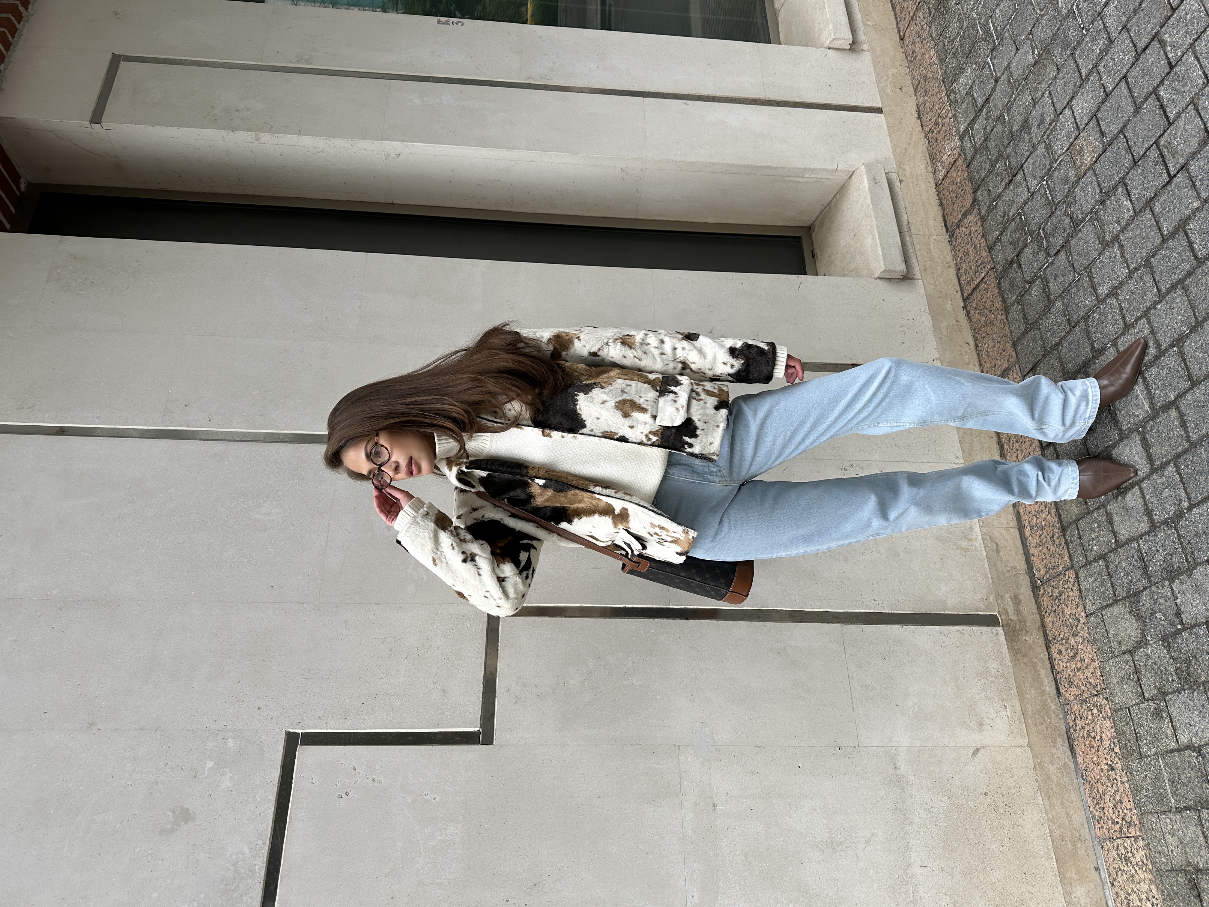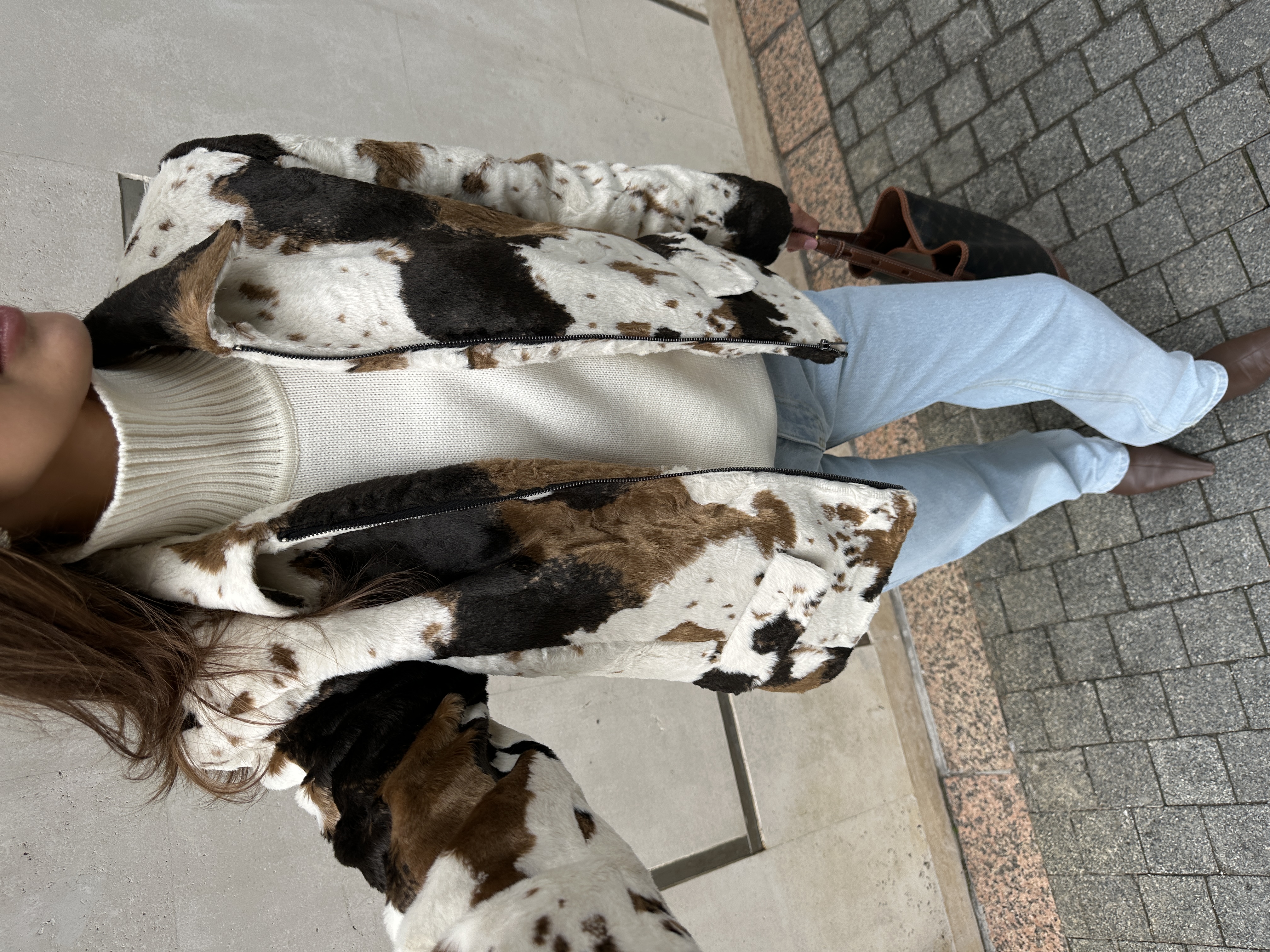 Бомбер прямого кроя с коровьим принтом из искусственного меха.