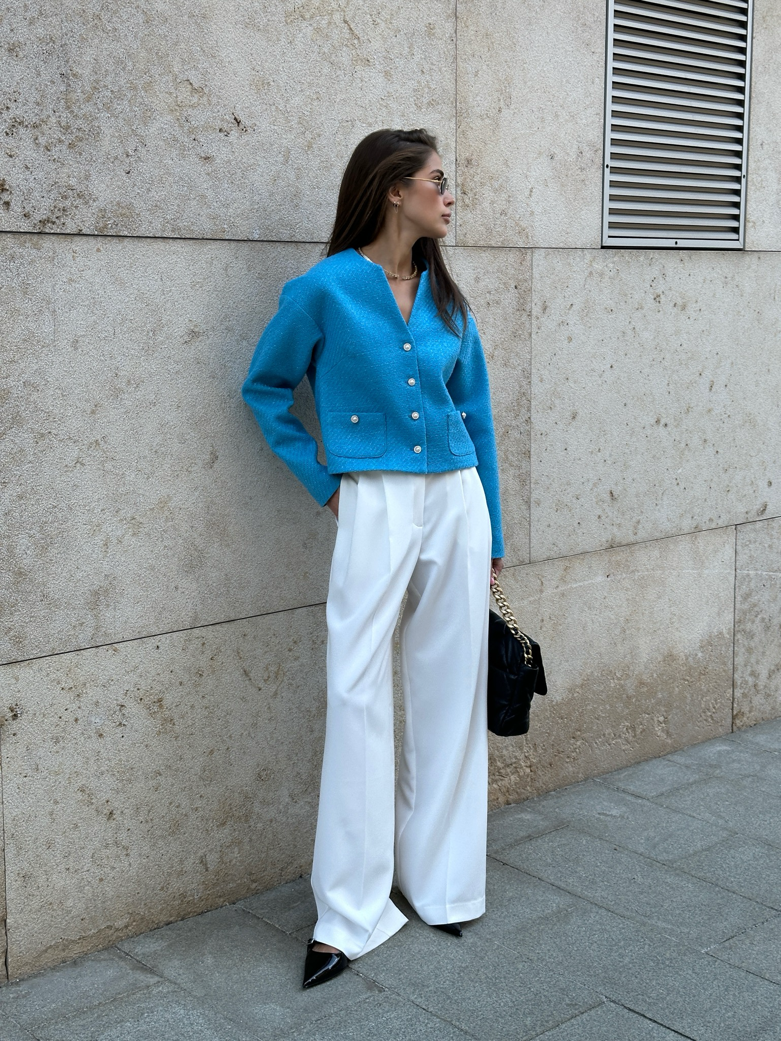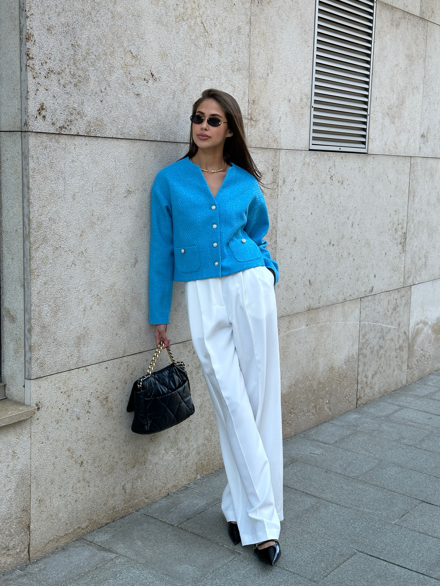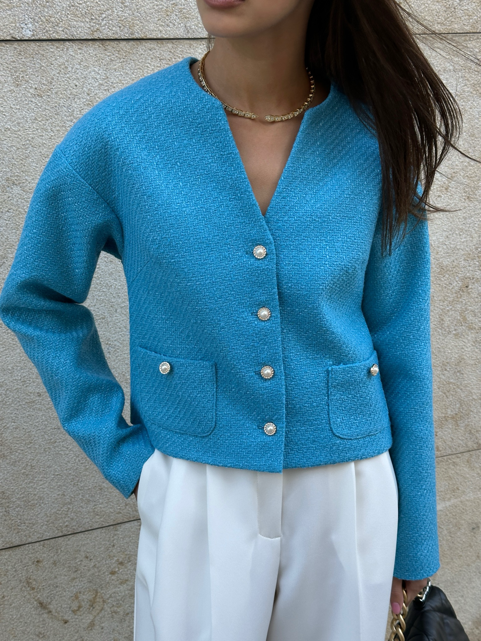 Бомбер из твида в бирюзовом оттенке для ярких, запоминающихся образов. Выполнен на подкладке из поливискозы.