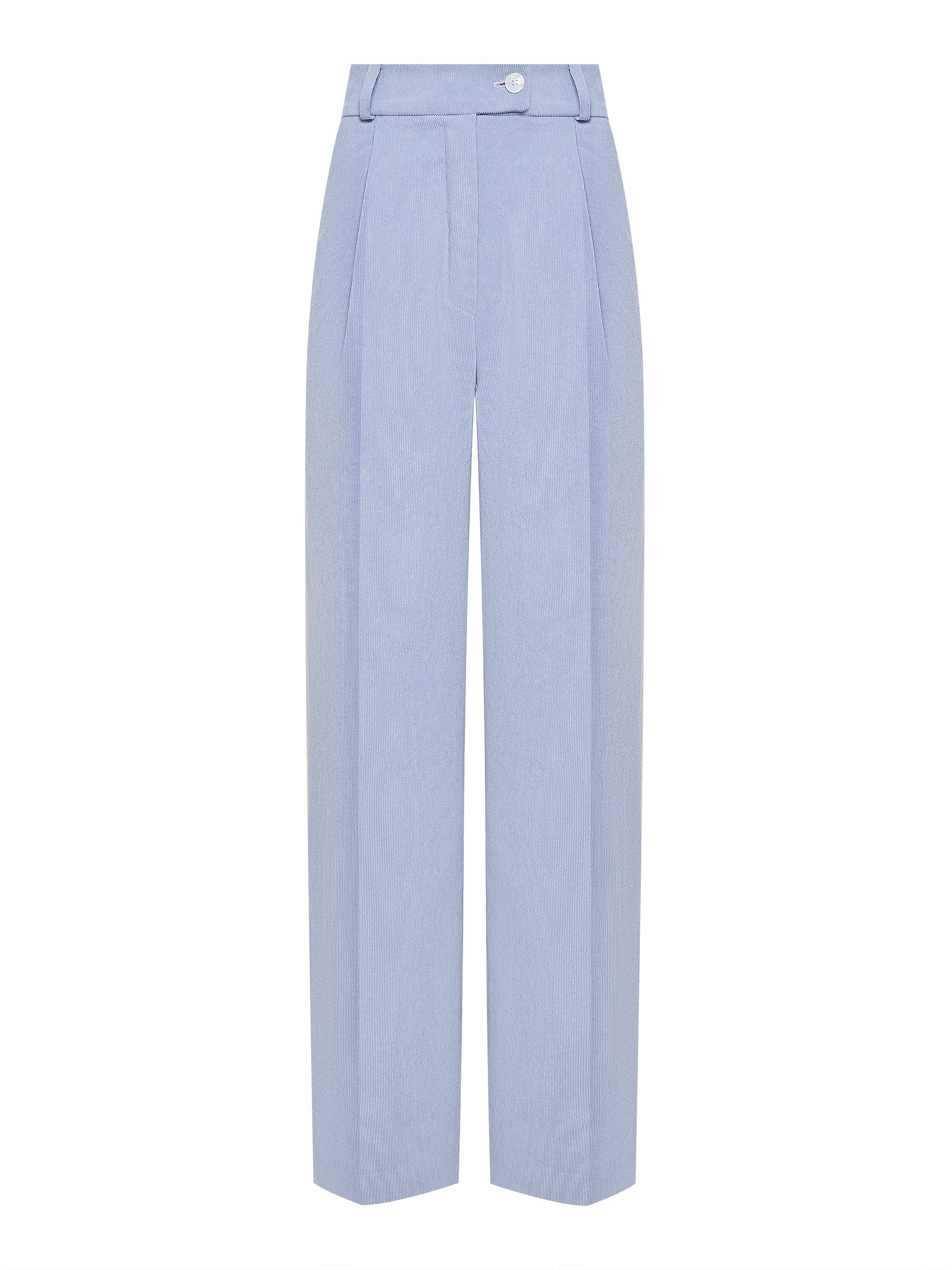 Классический фасон брюк из голубого вельвета со складками у талии и карманами в боковых швах.