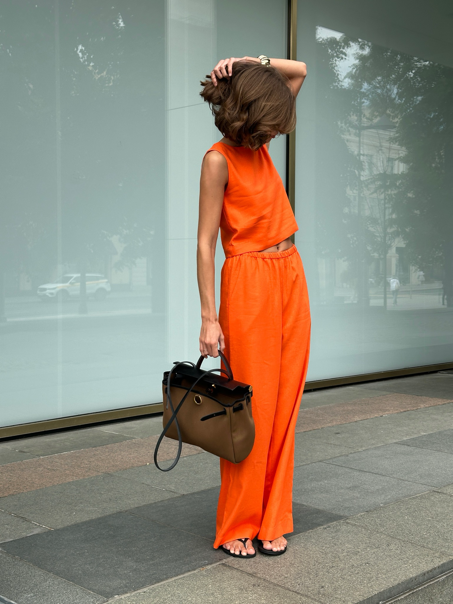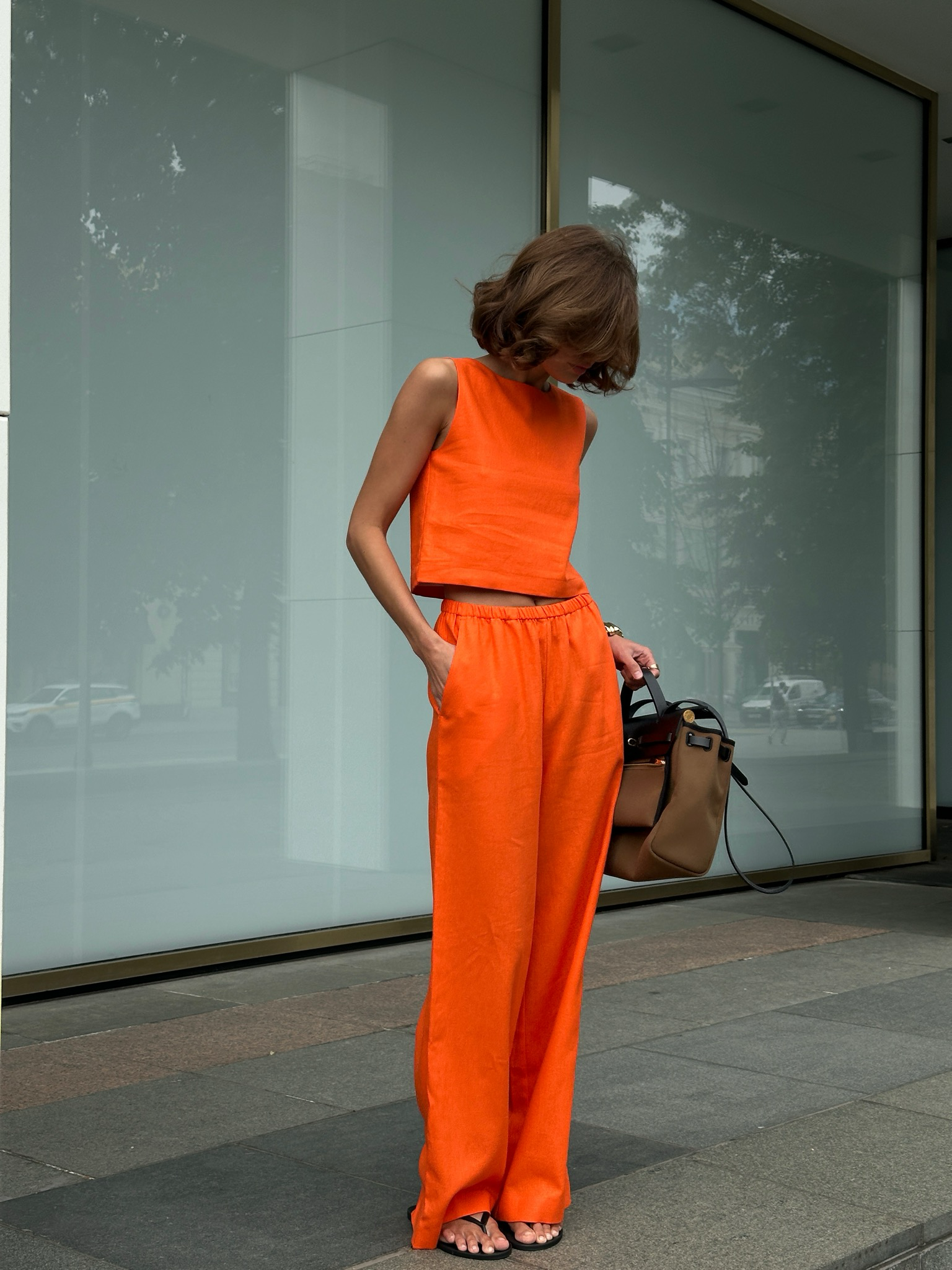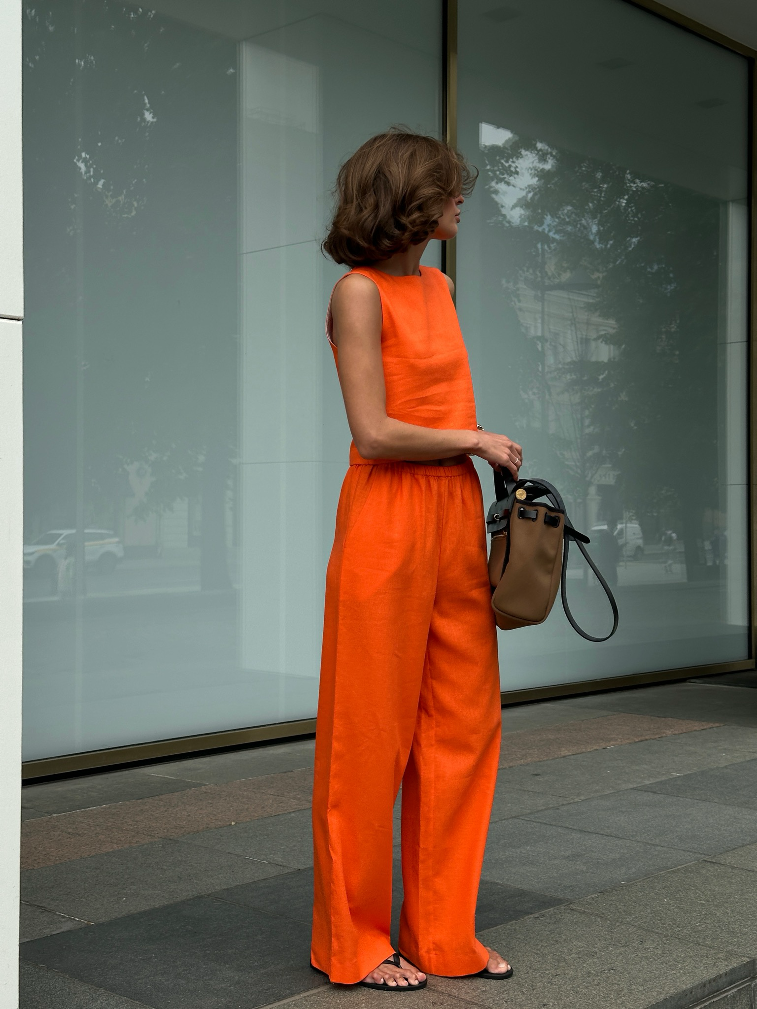 Прямые брюки из оранжевого льна для легких, летних образов.