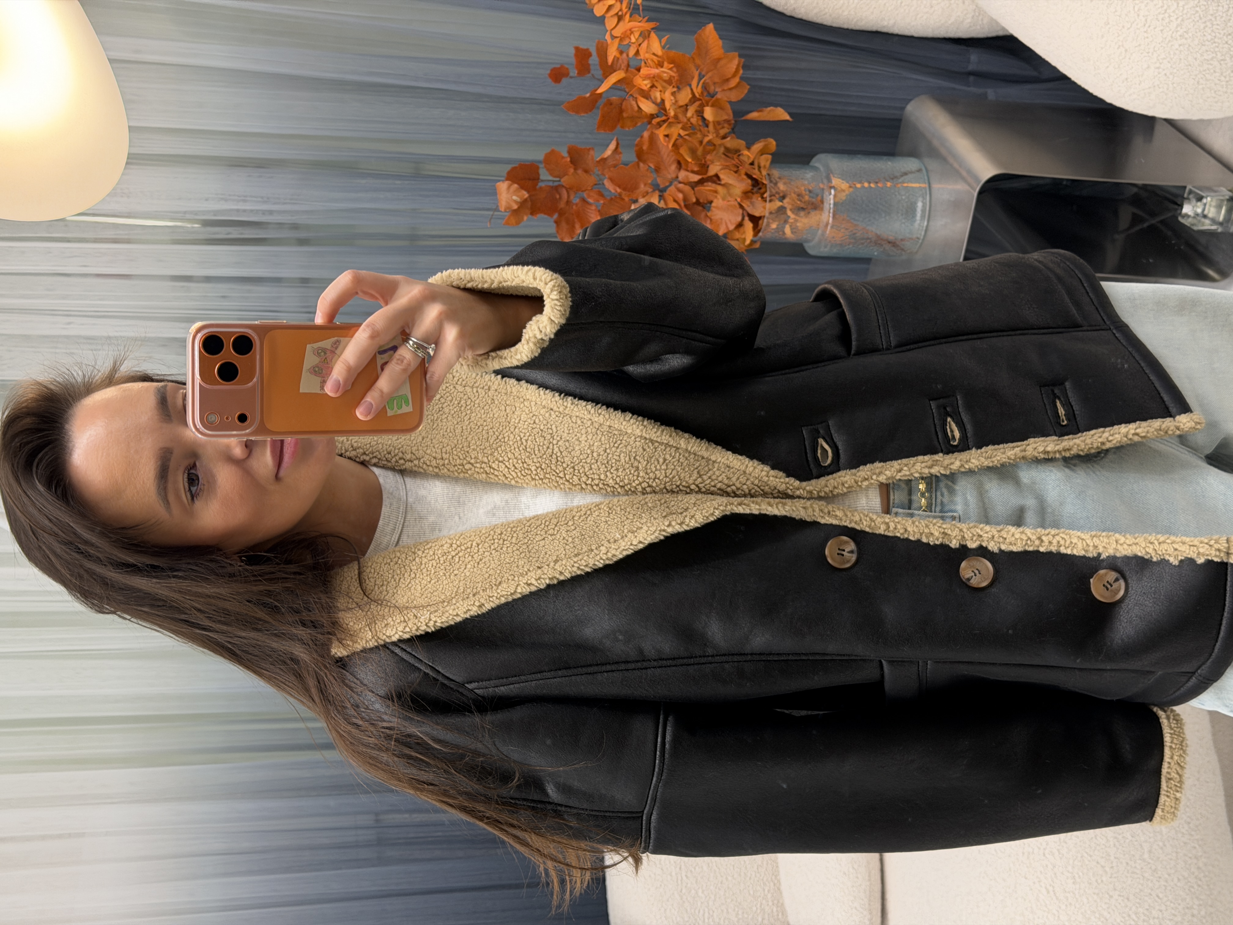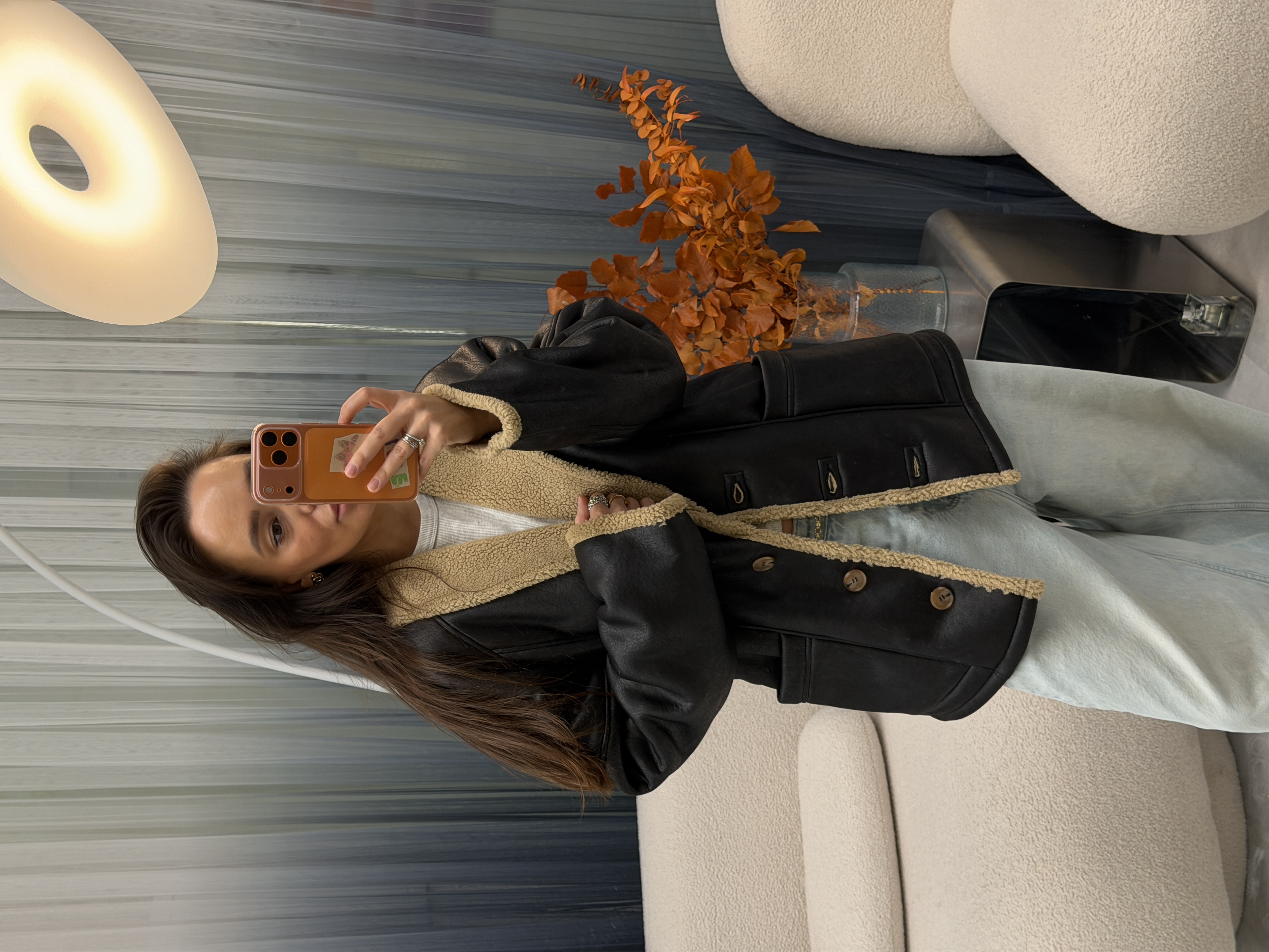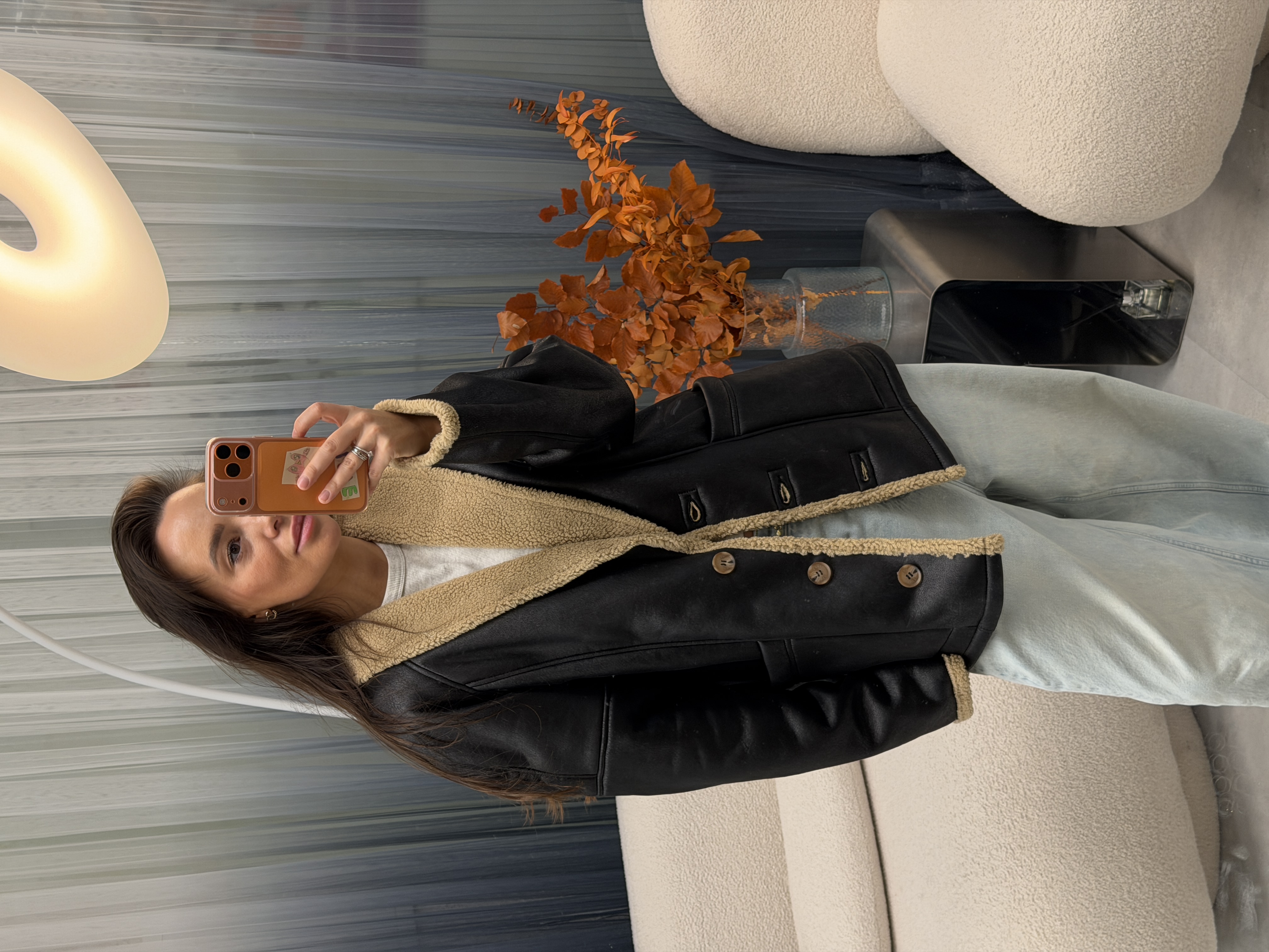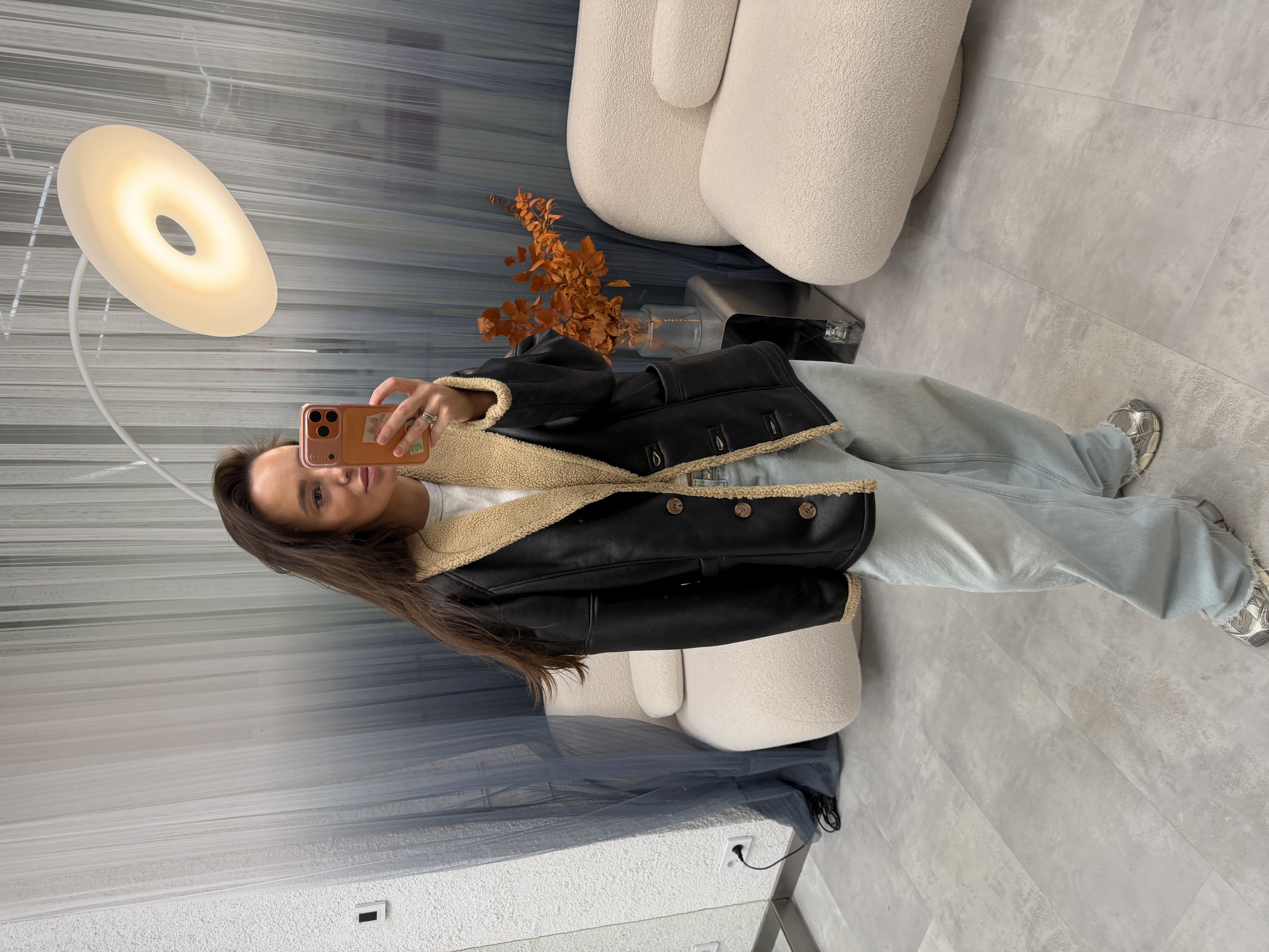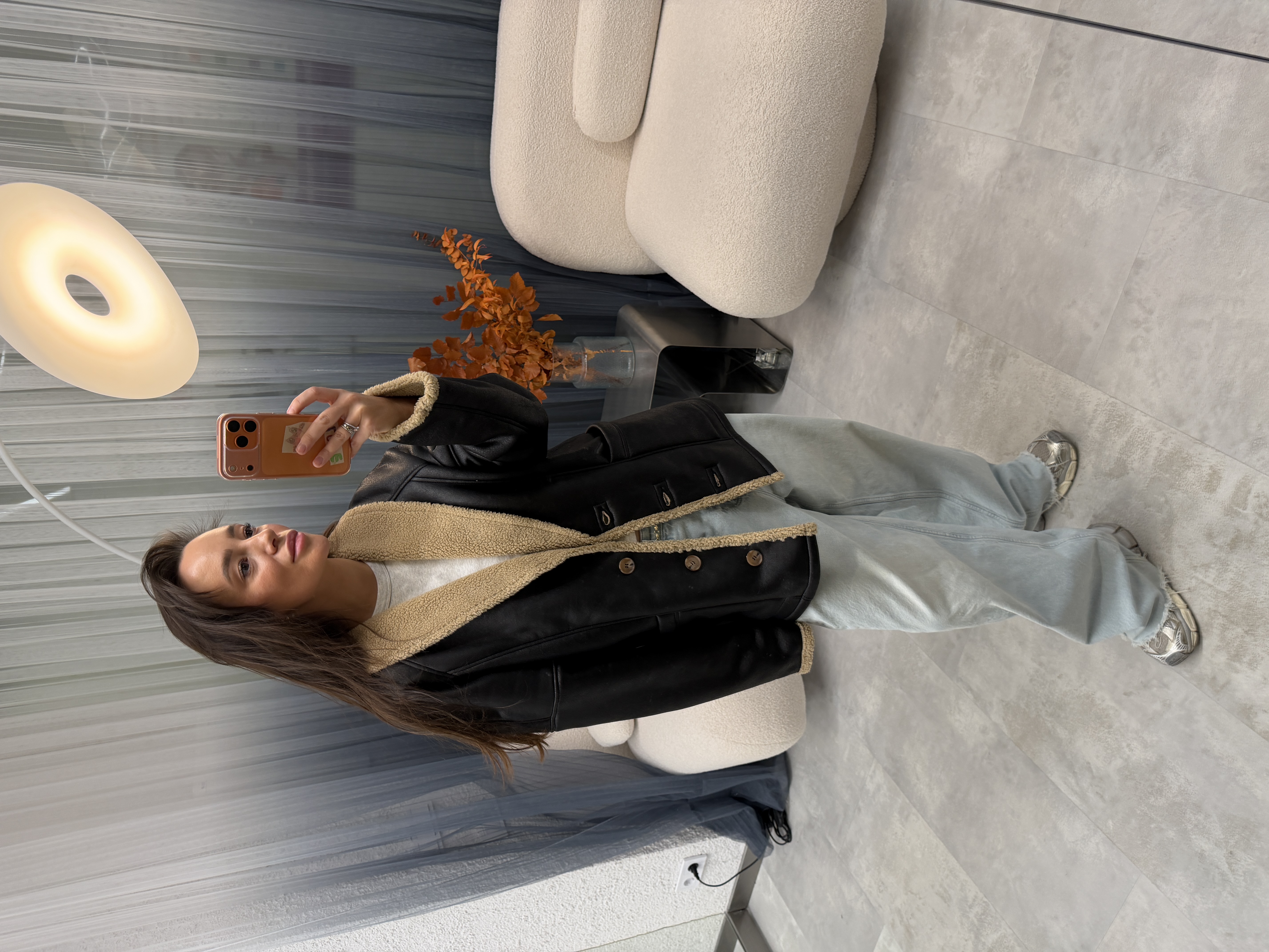 Стильная, демисезонная дубленка из искусственного меха в черном оттенке.