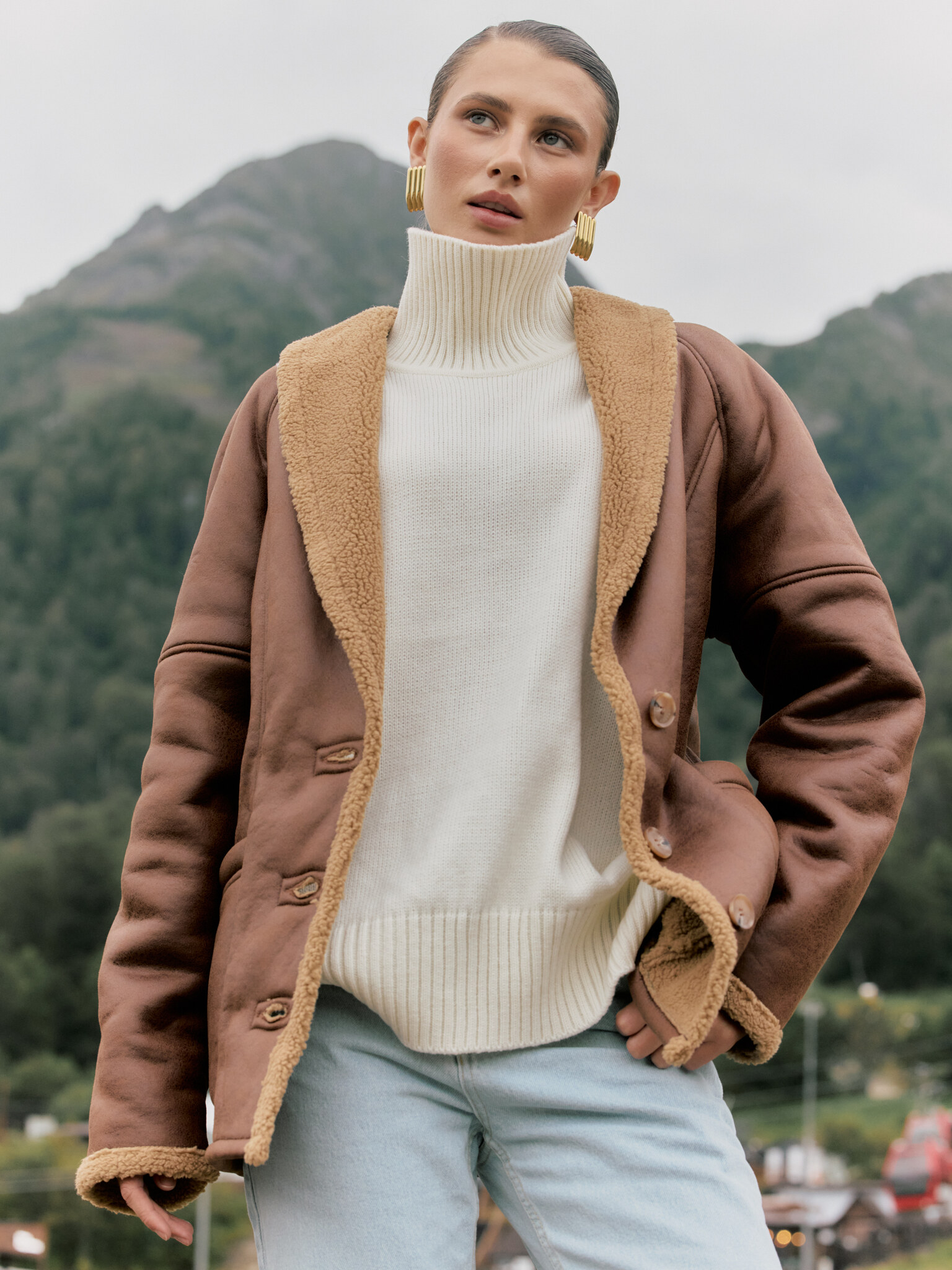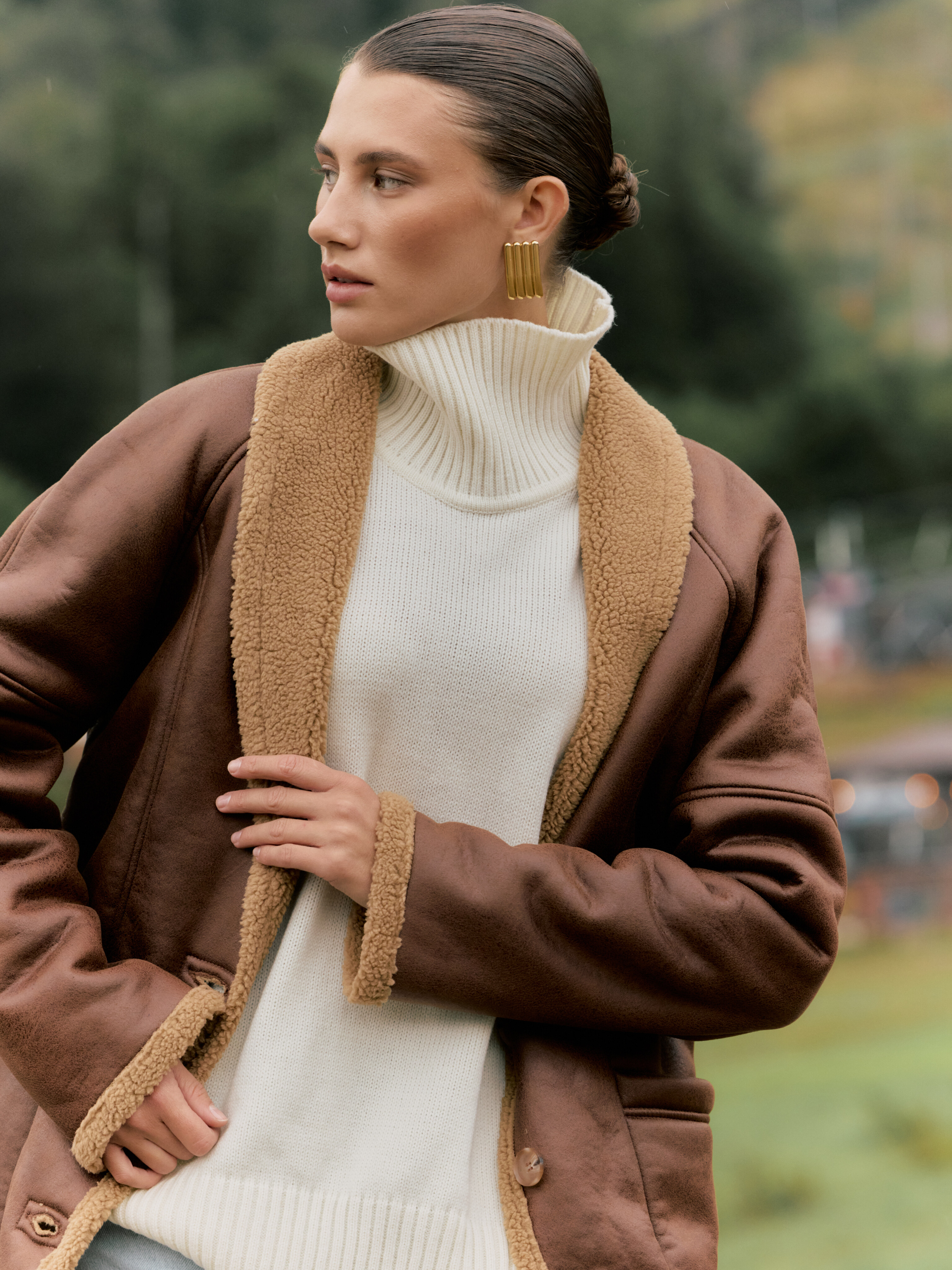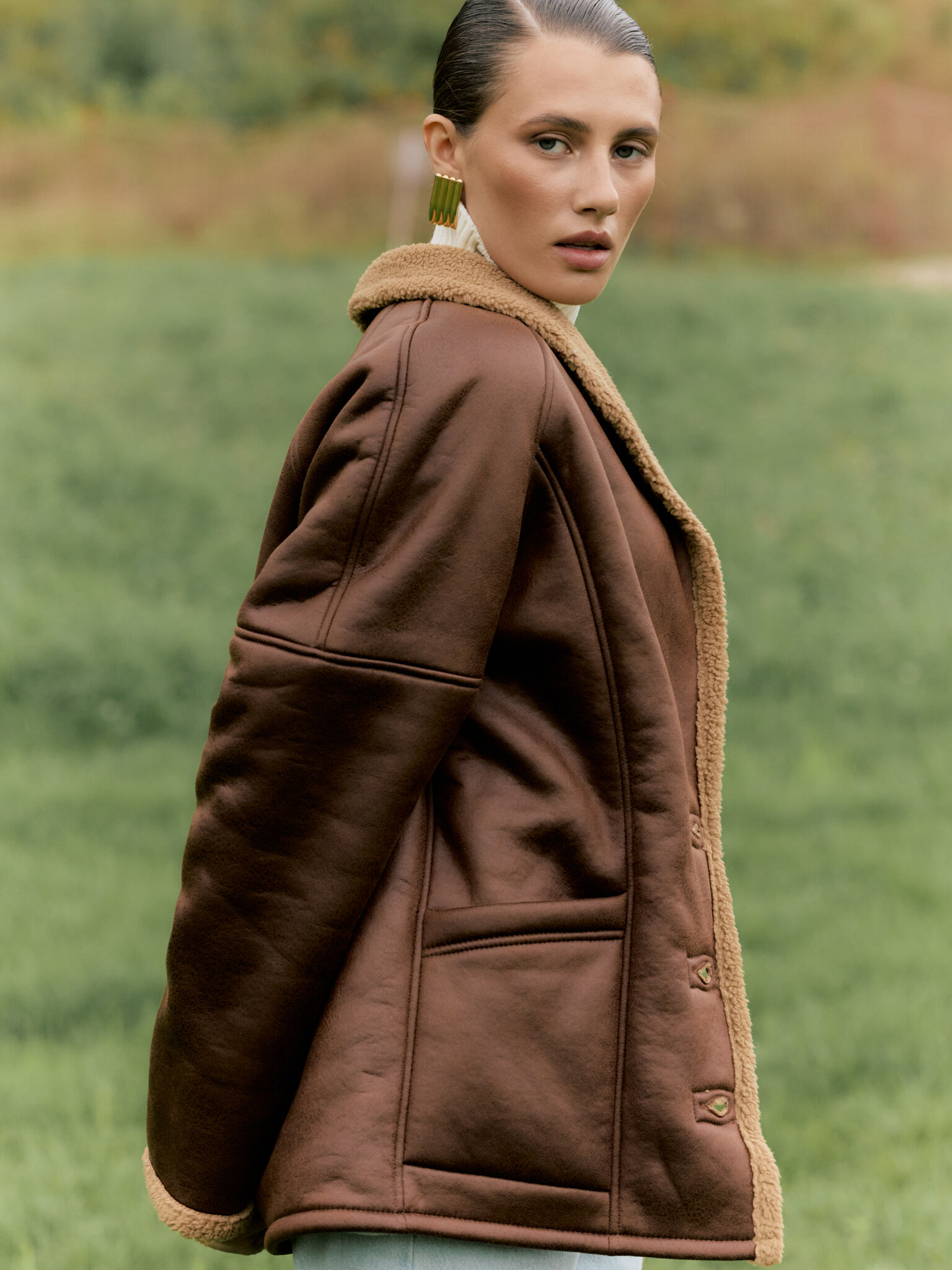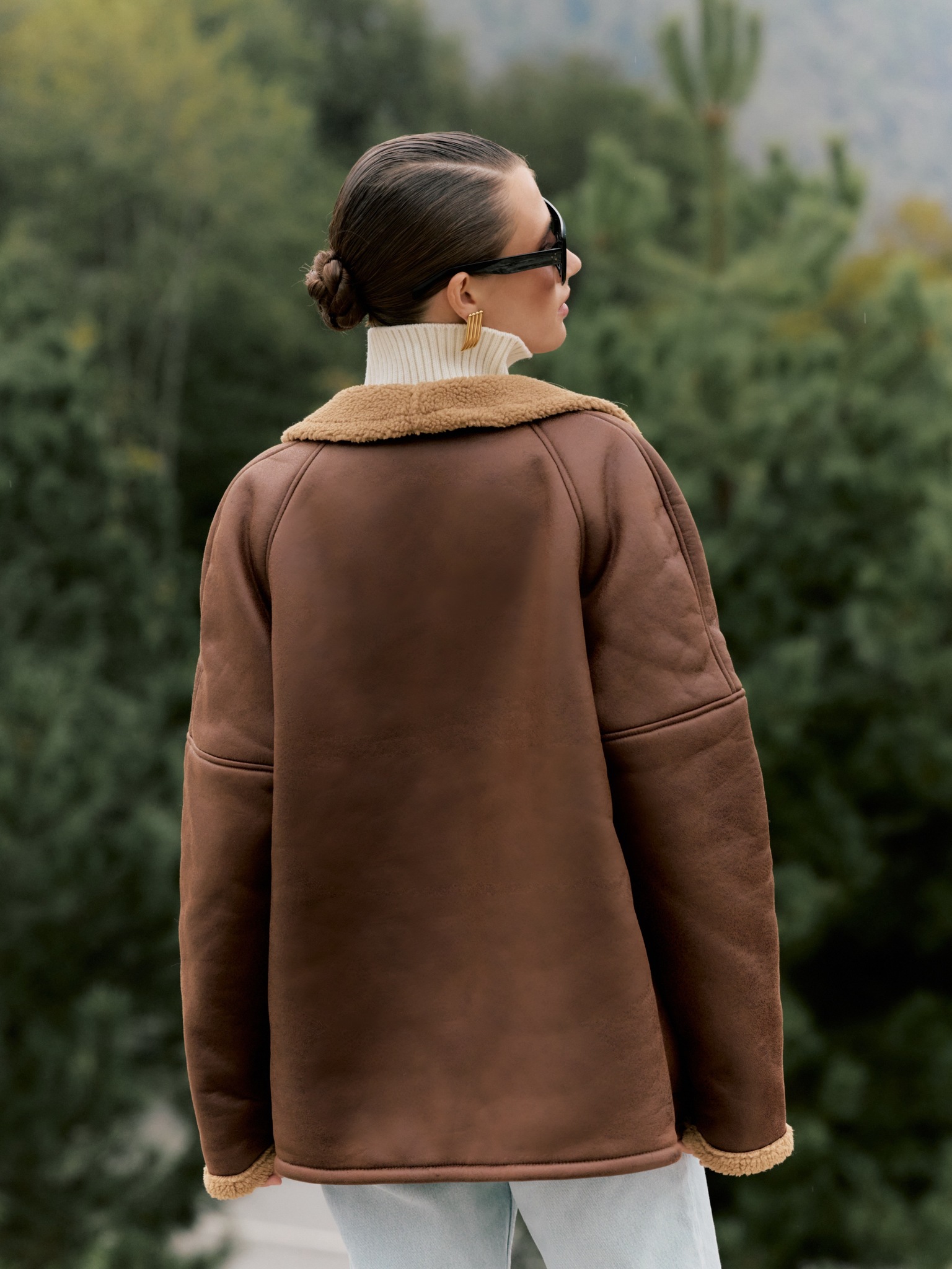 Стильная, демисезонная дубленка из искусственного меха в коричневом оттенке.