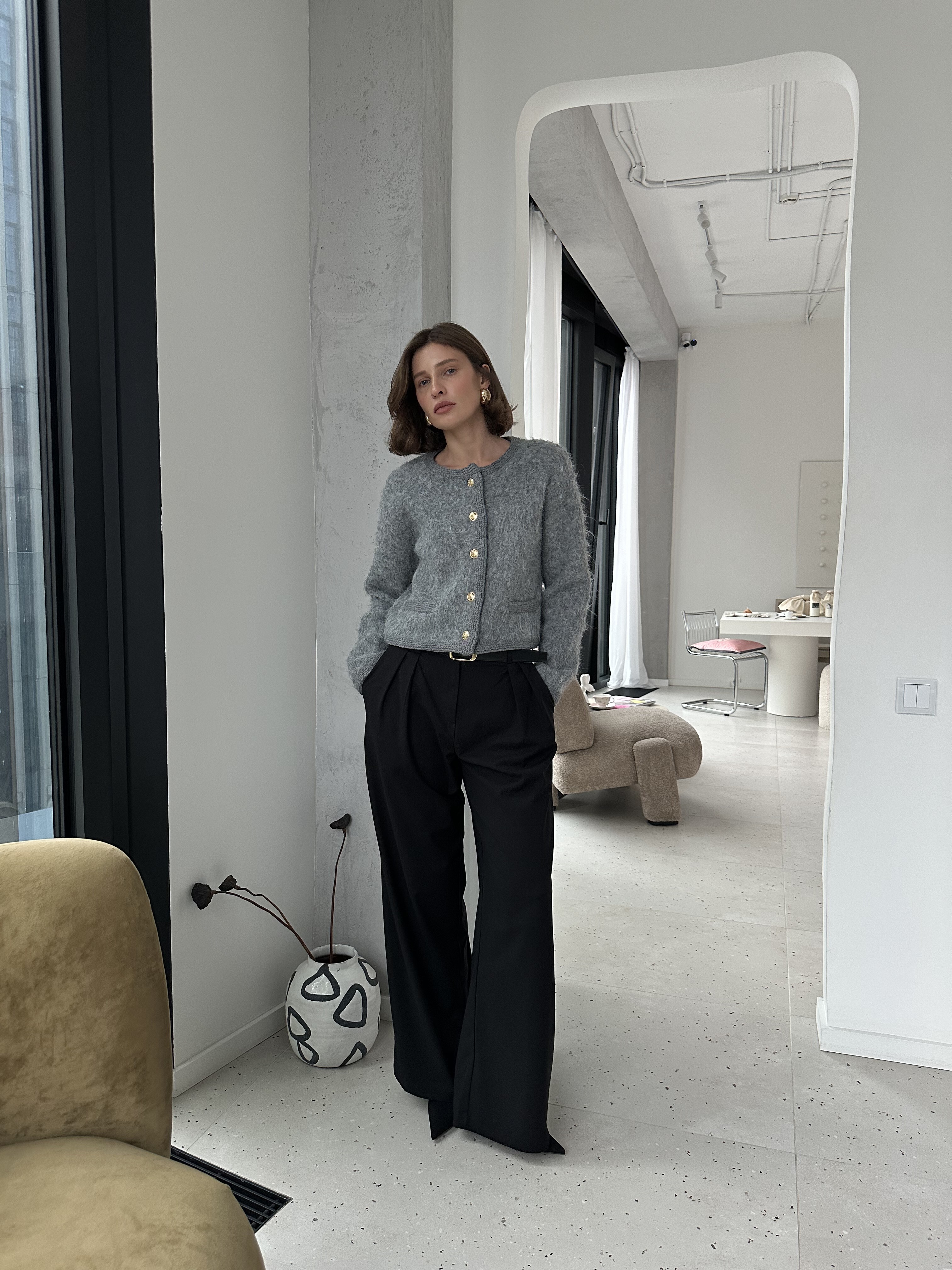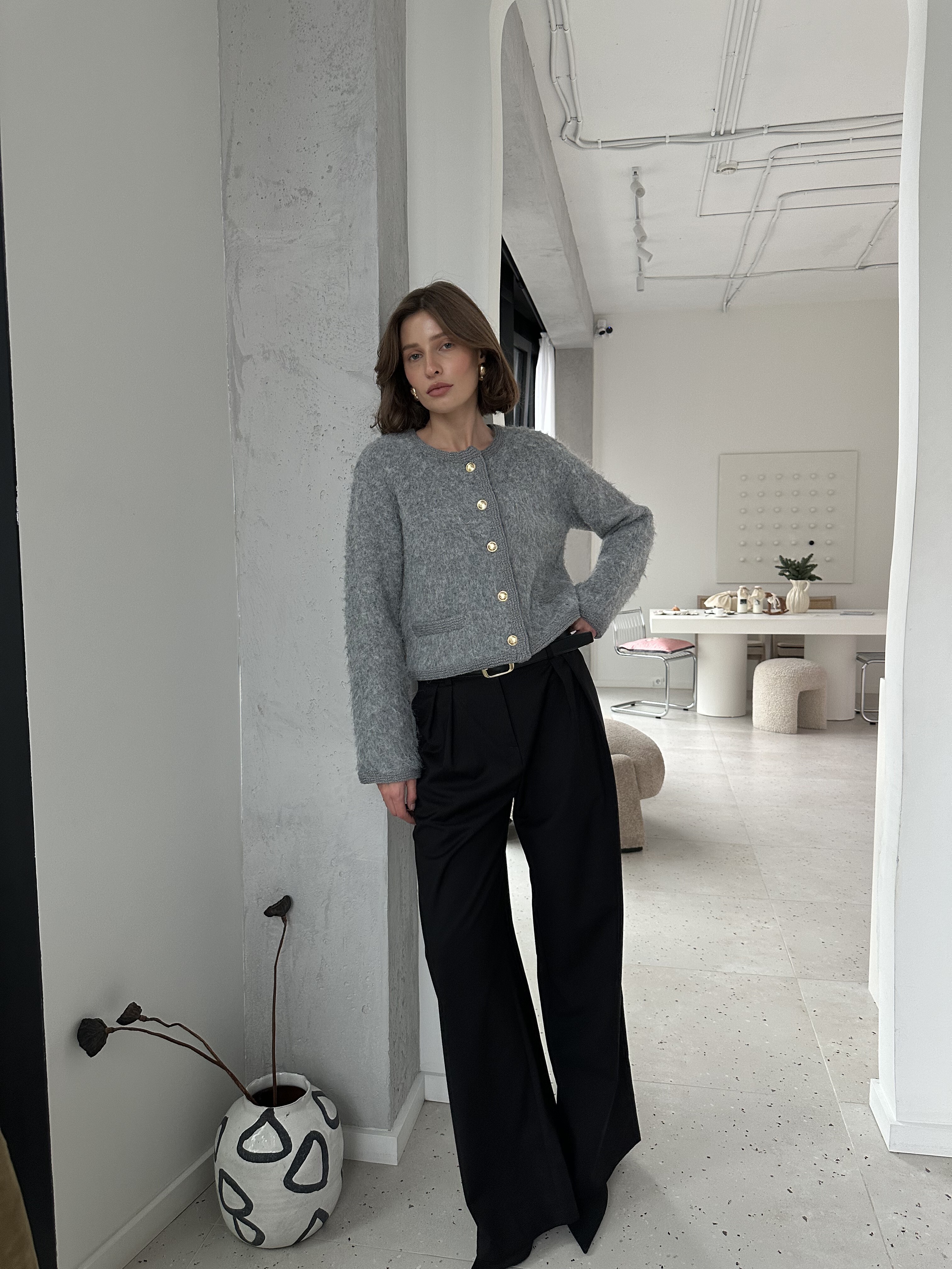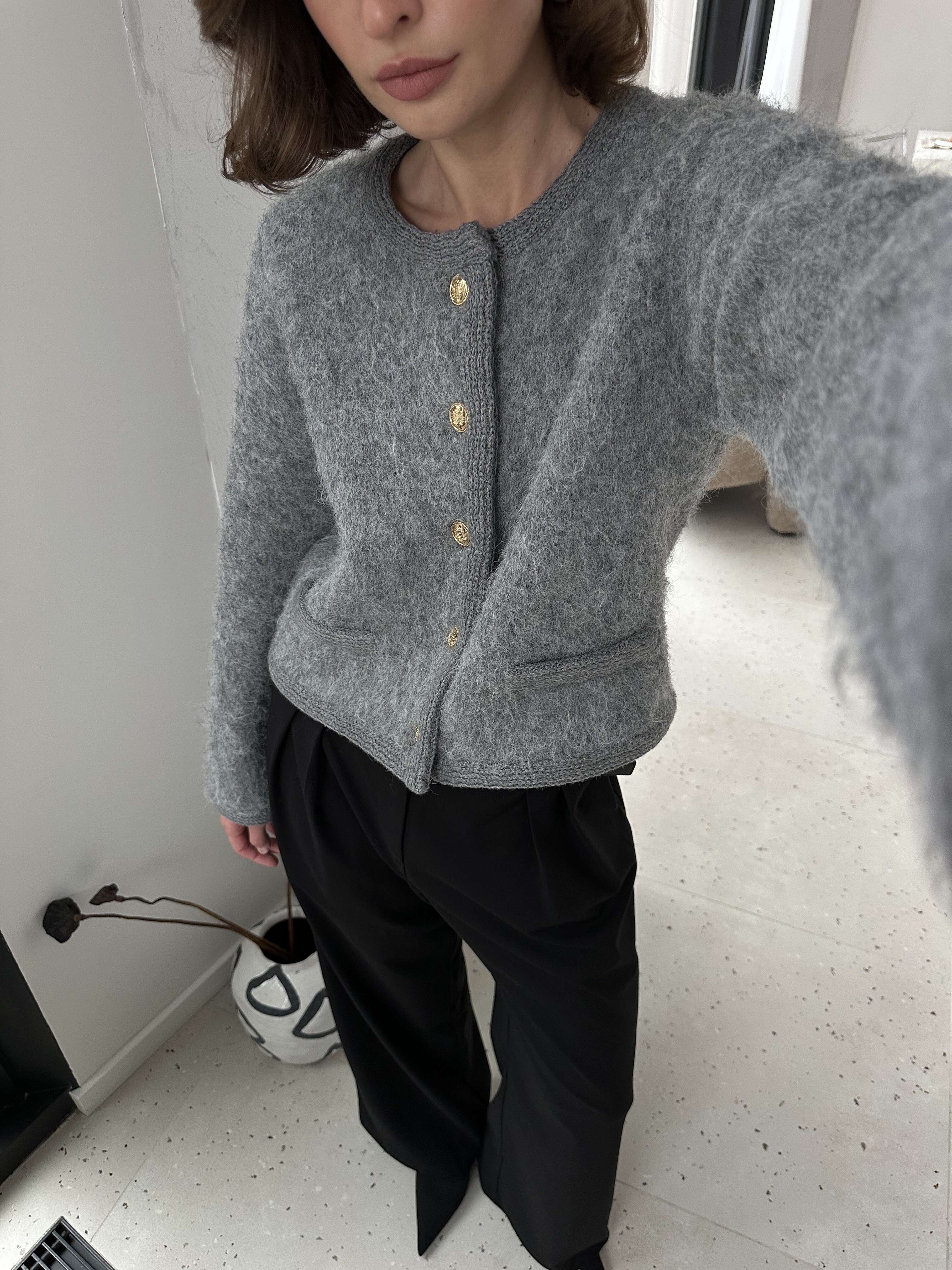 Укороченный кардиган из трикотажа пушистой фактуры с кантом в базовом сером оттенке.