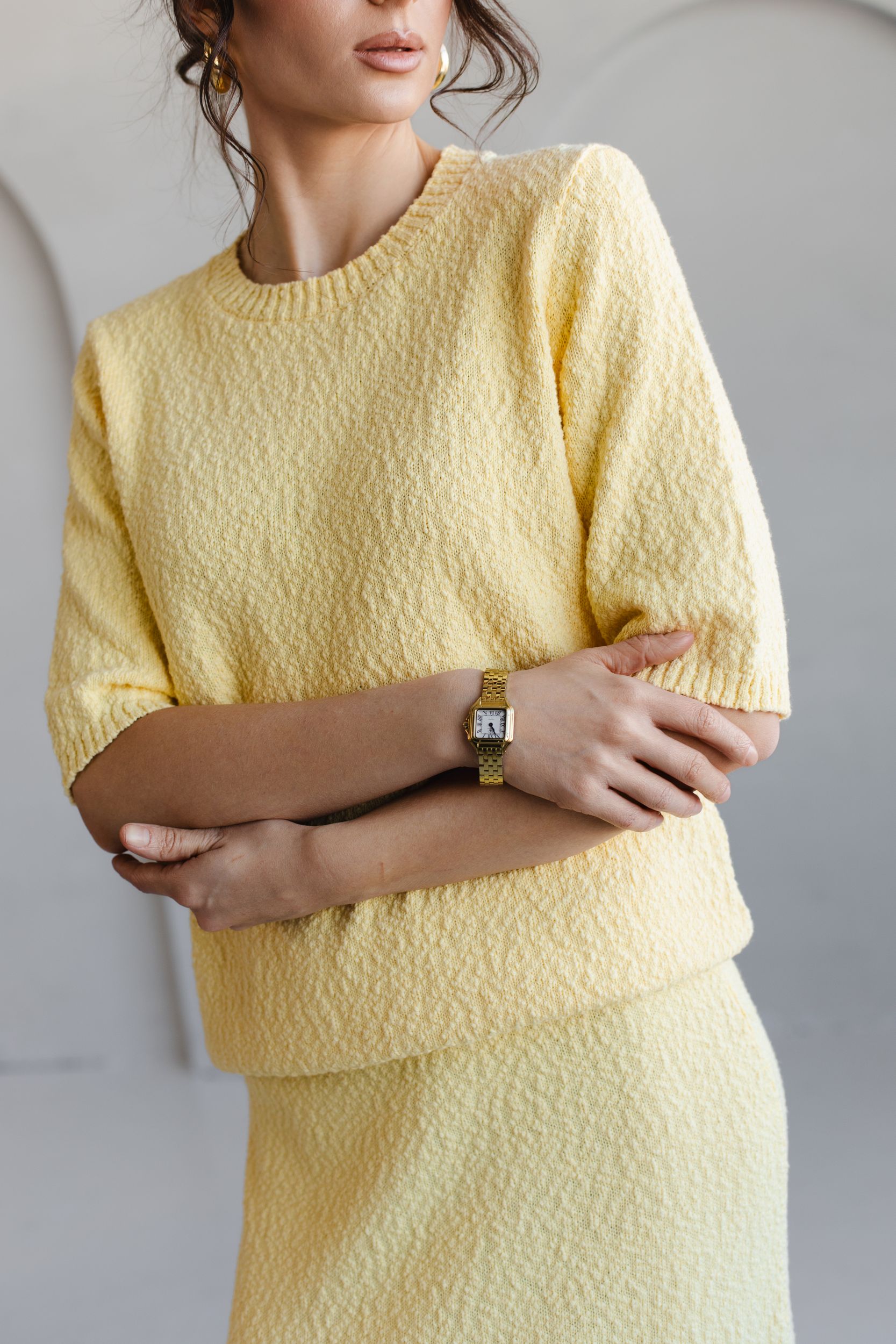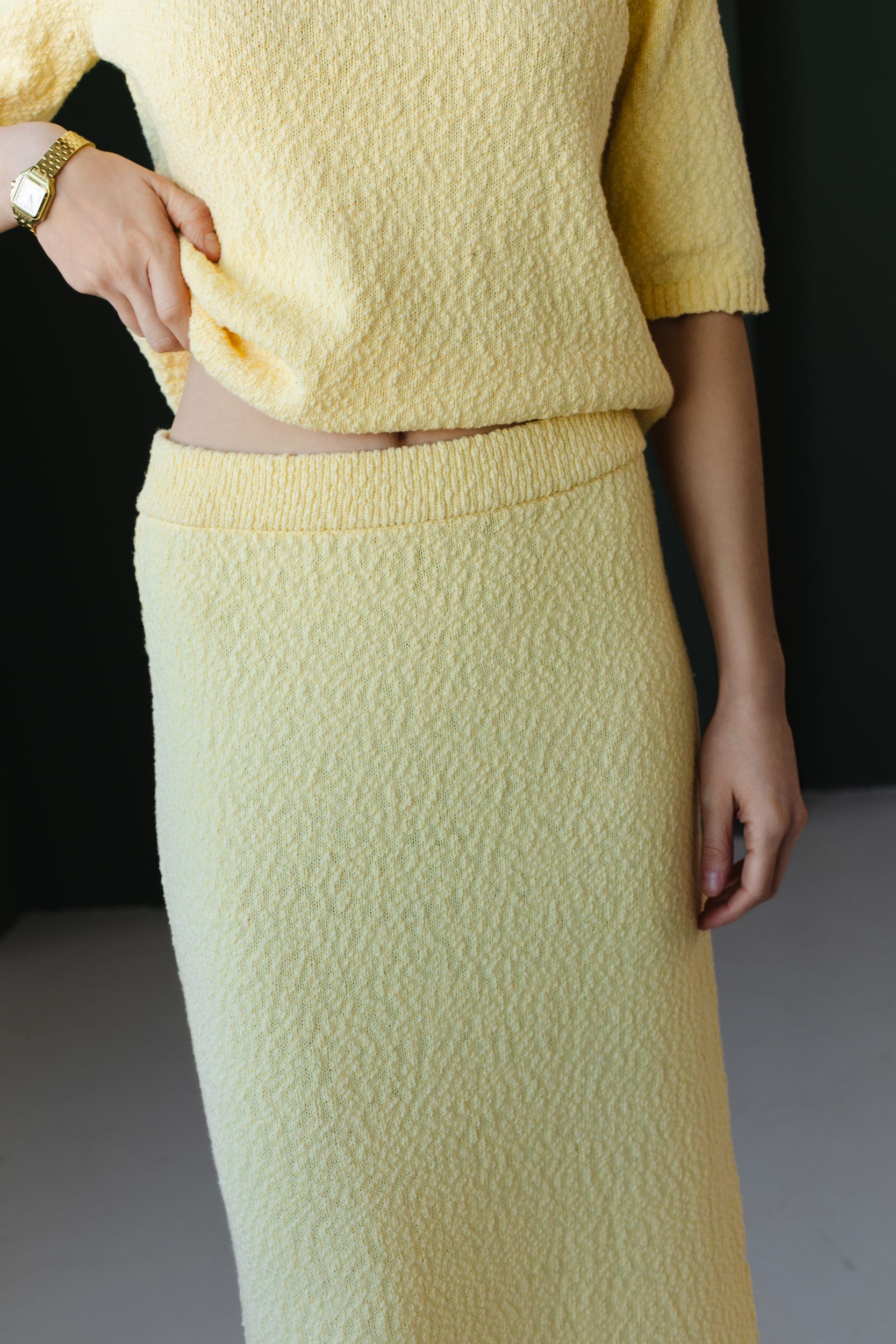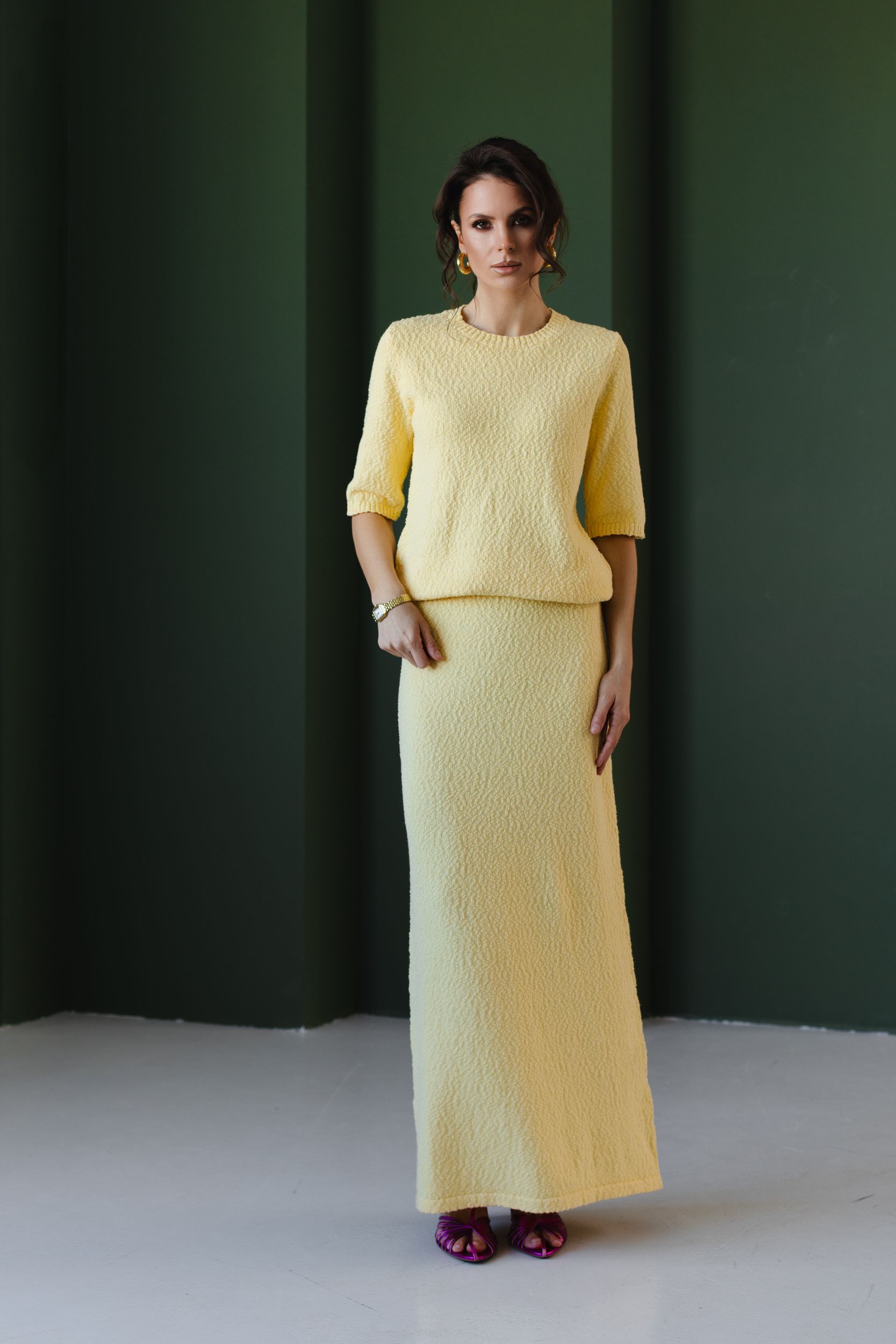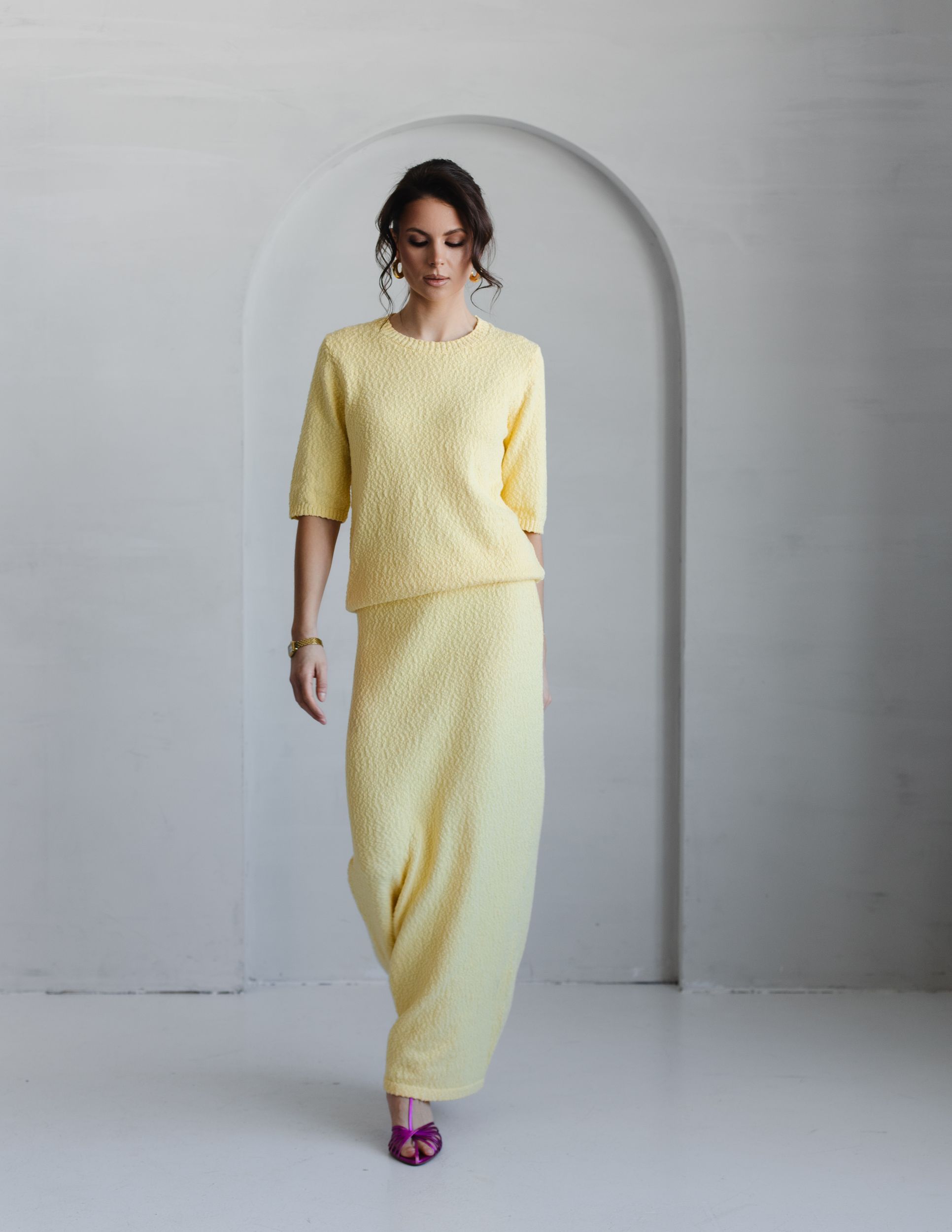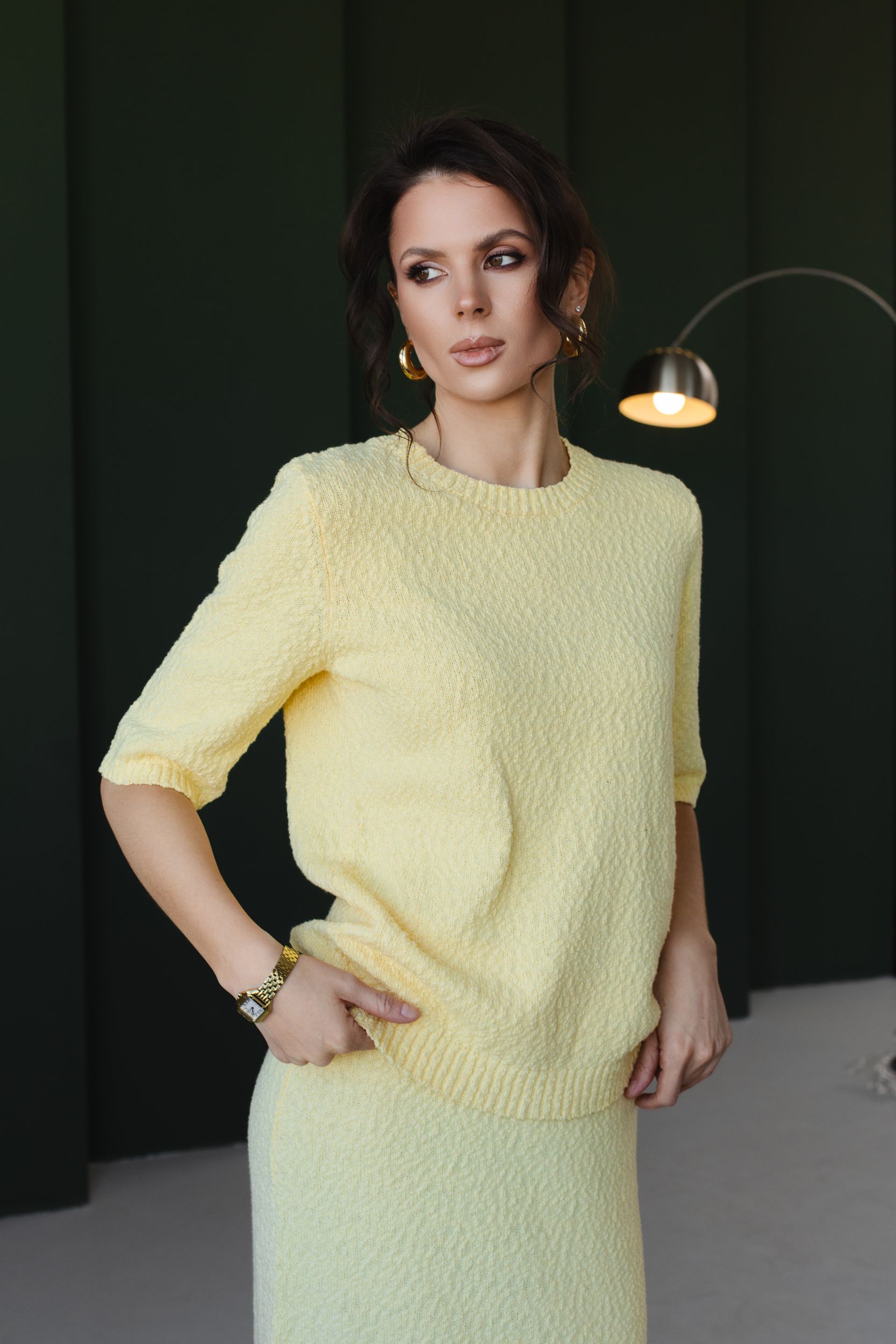 Вязаный костюм из фактурной хлопковой пряжи в самом весеннем - лимонном оттенке.
