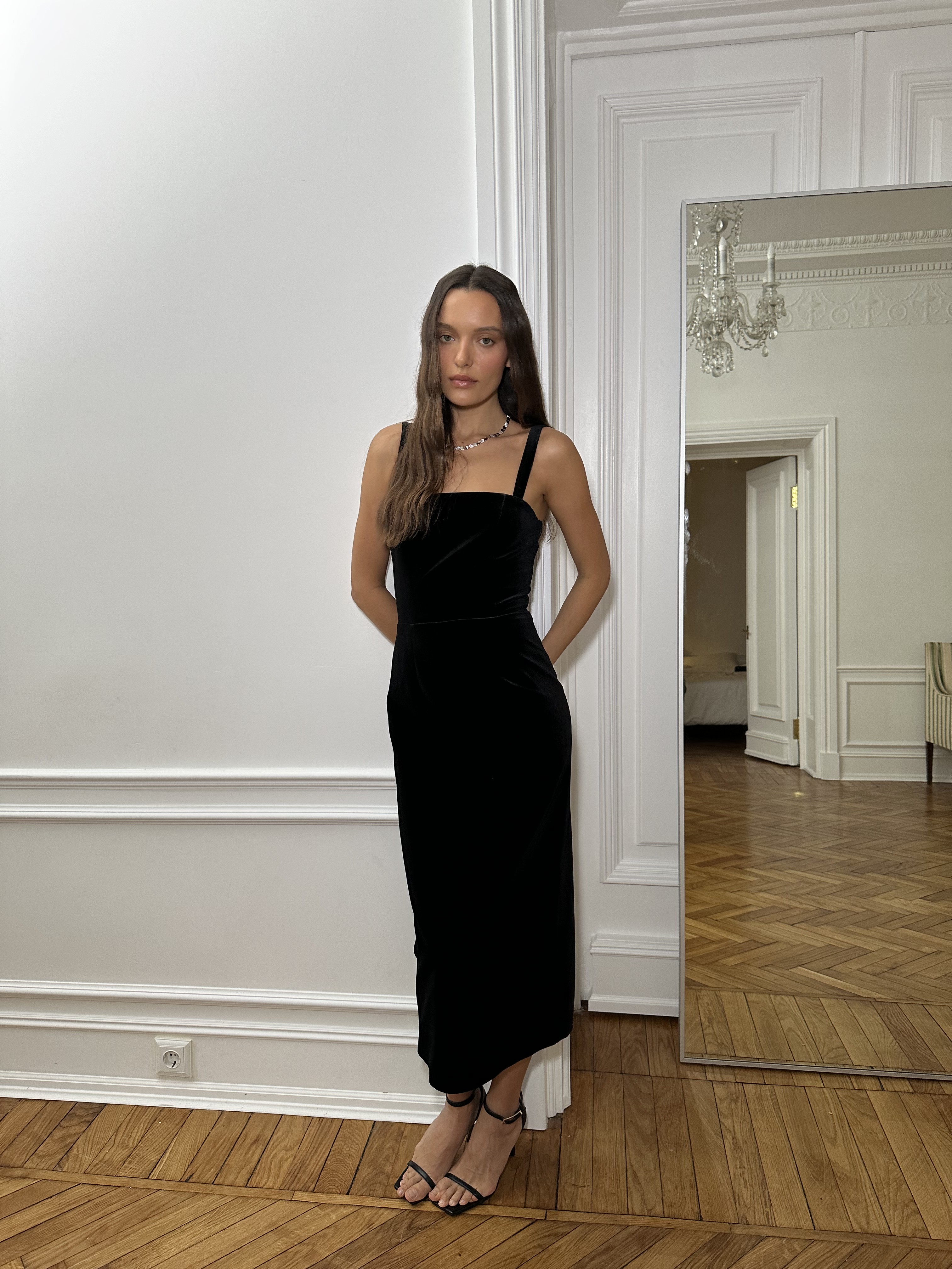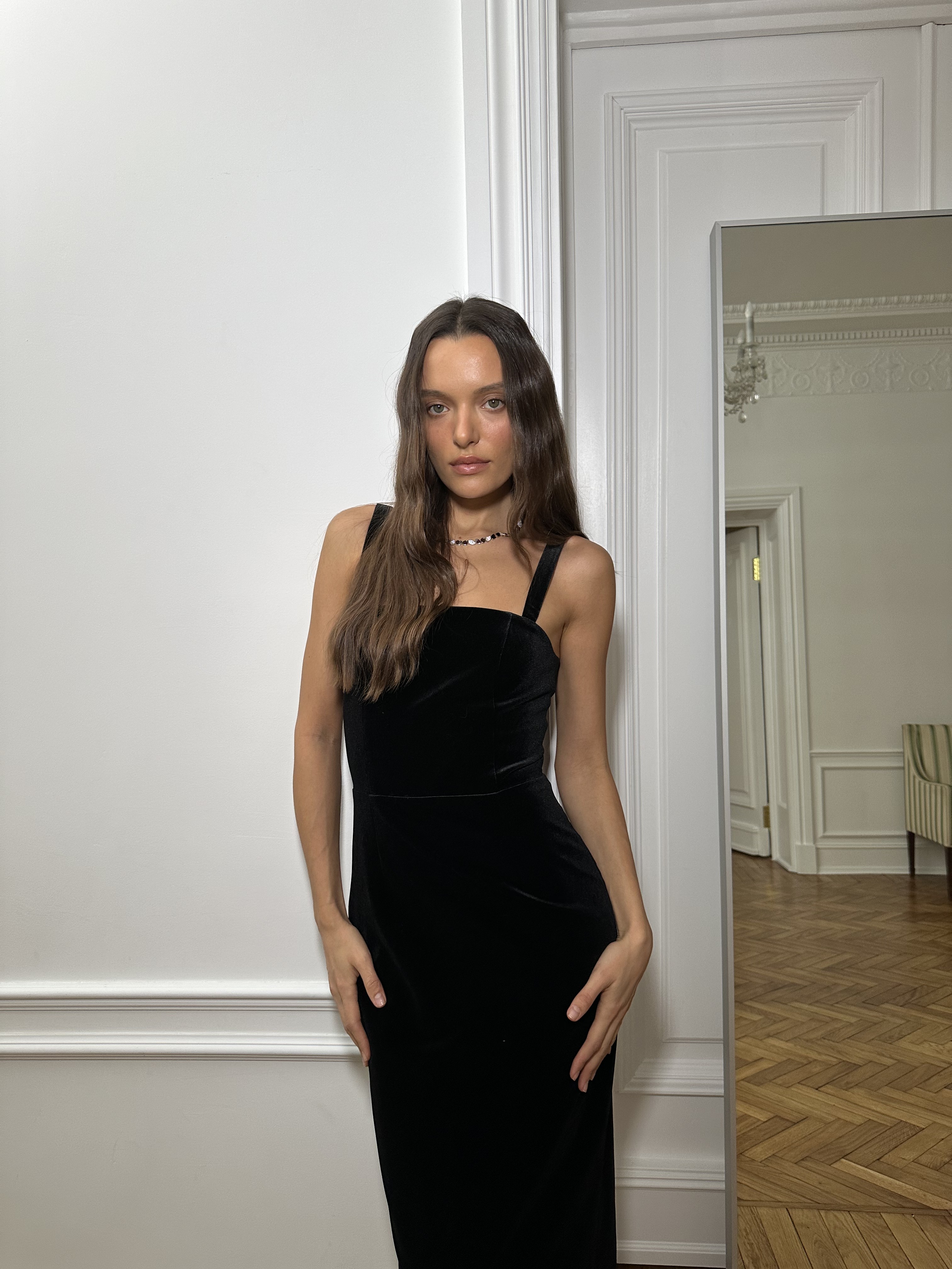 XS/40: обхват по груди - 82-84 см, обхват по талии - 66-68 см, обхват по бедрам - до 94 см, длина платья от линии талии по переду - 84 см, высота разреза - 39 см.