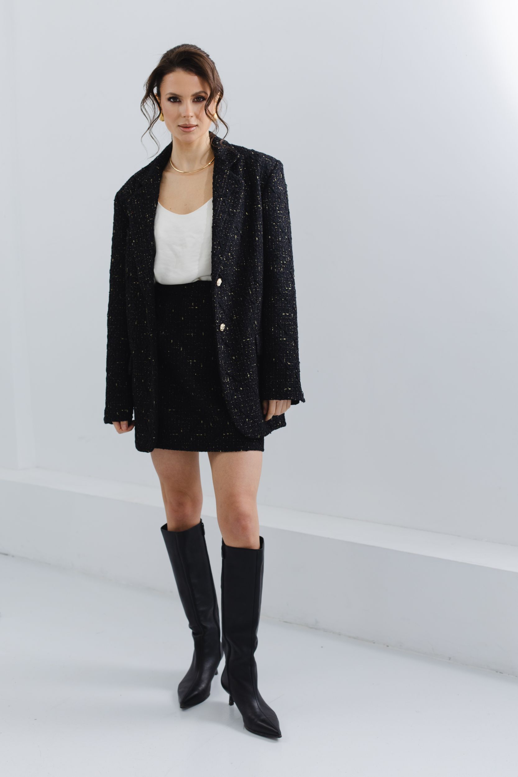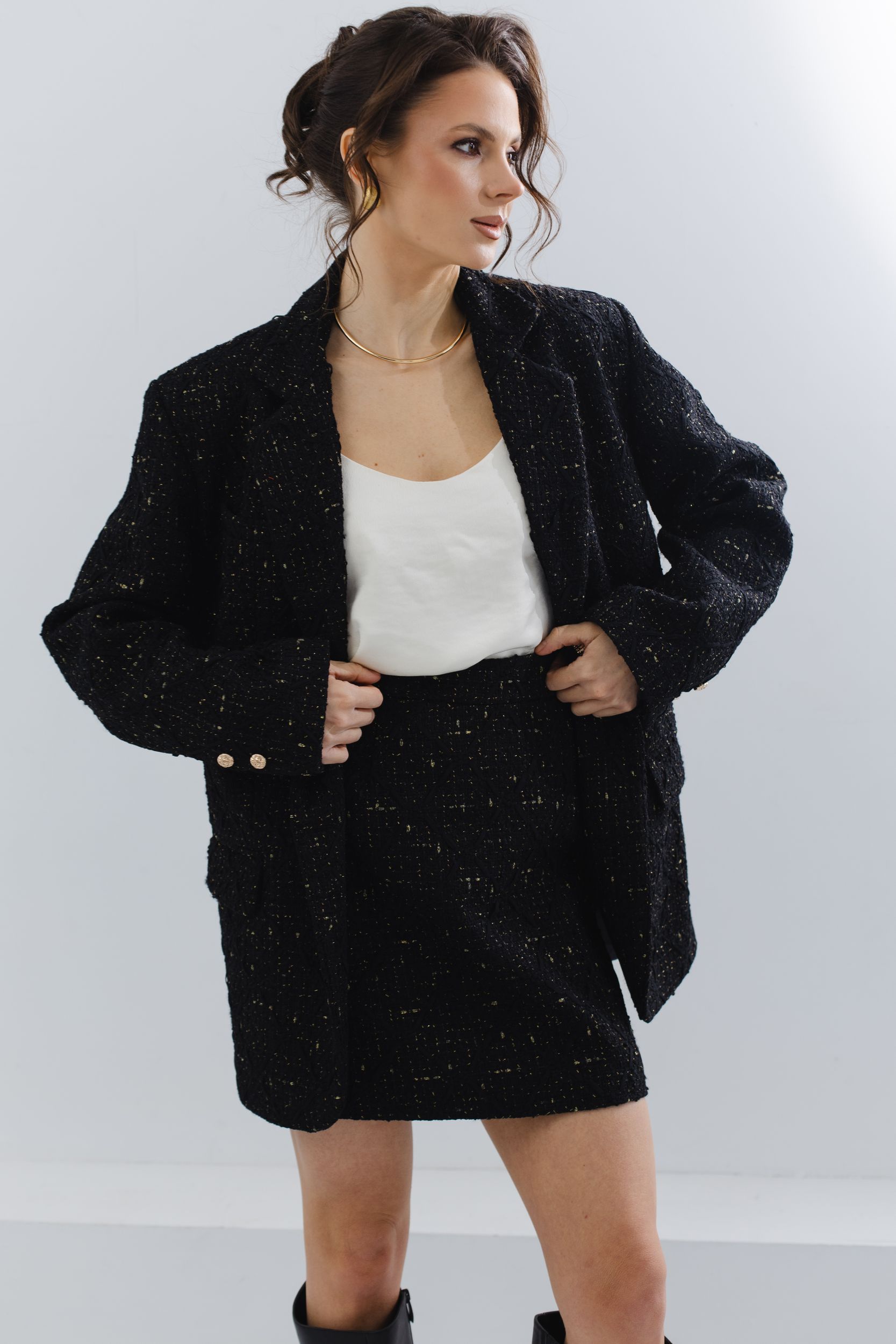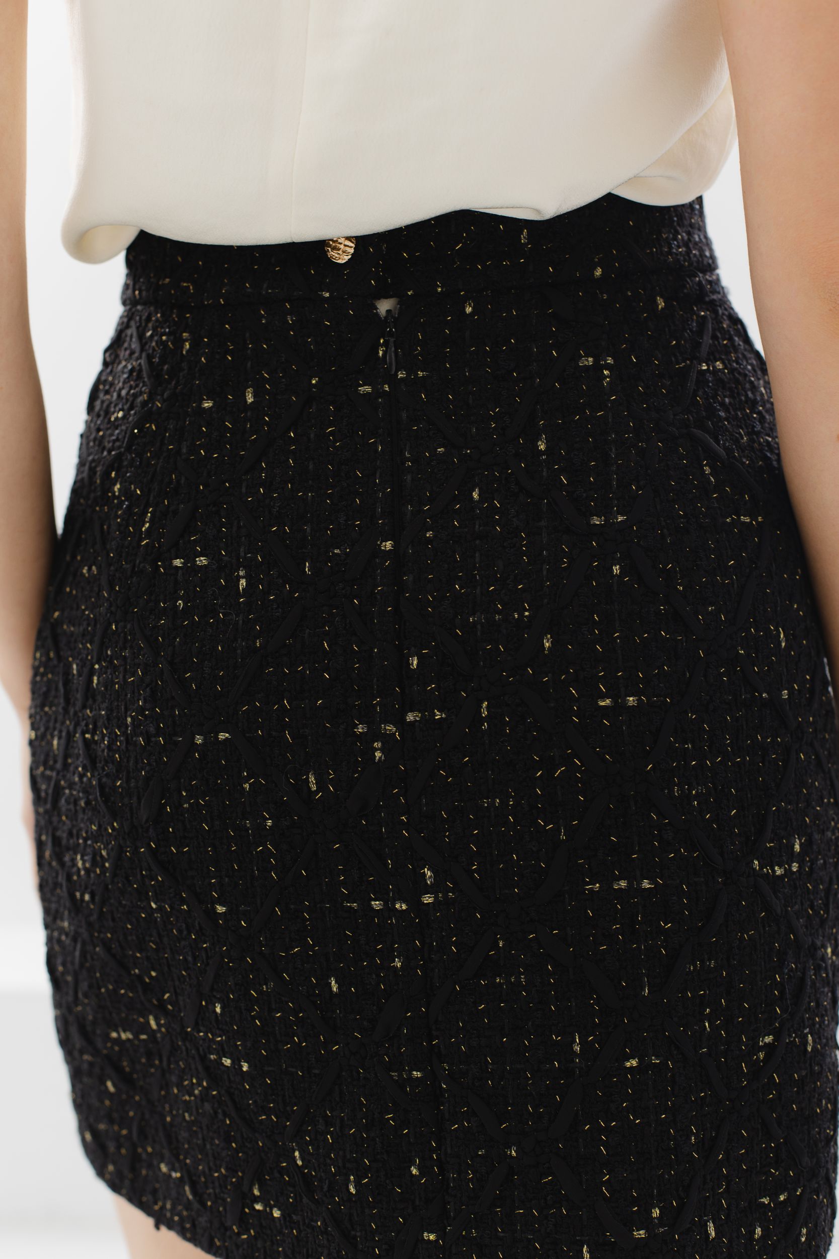 Юбка мини из черного твида с вкраплениями золотых нитей.