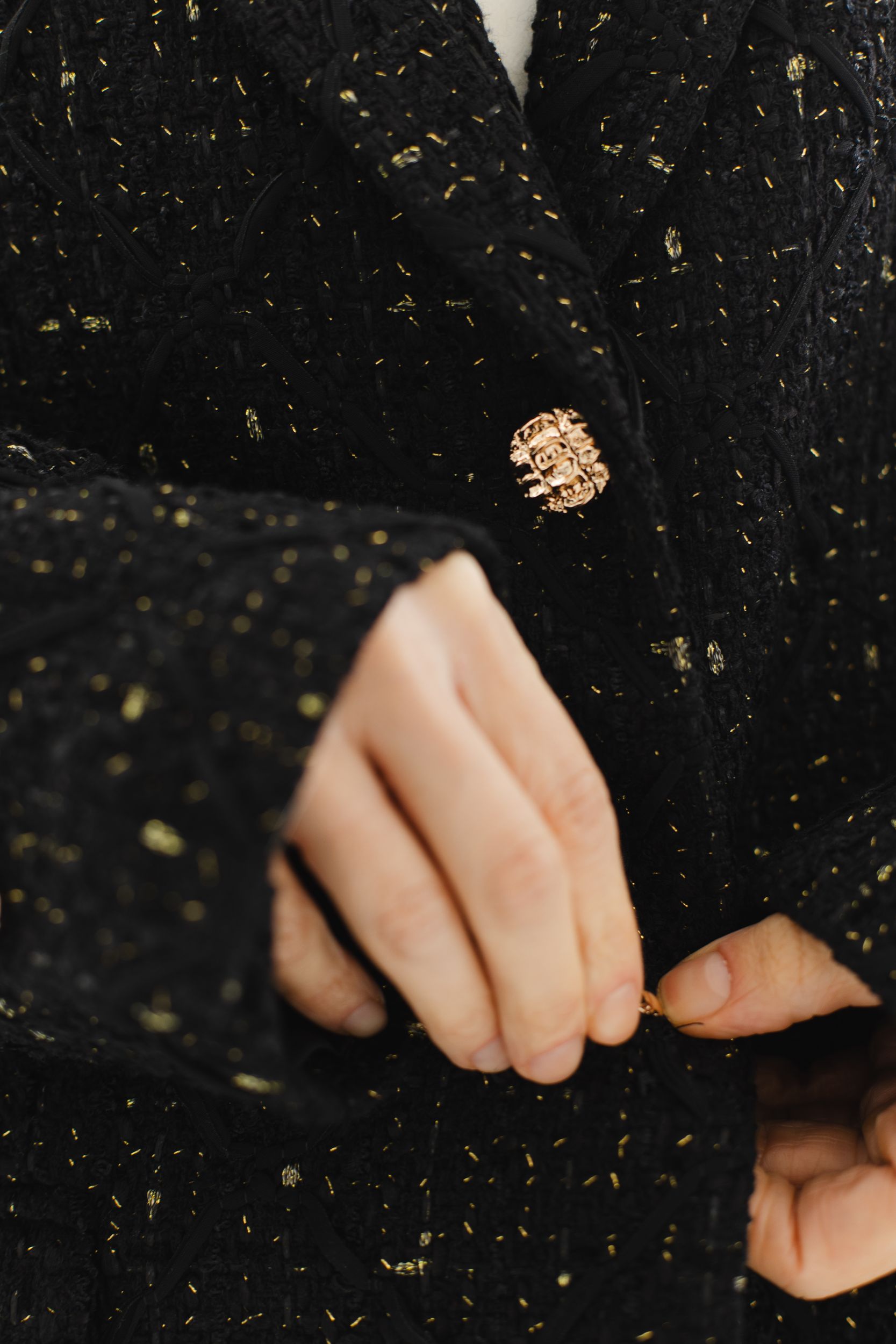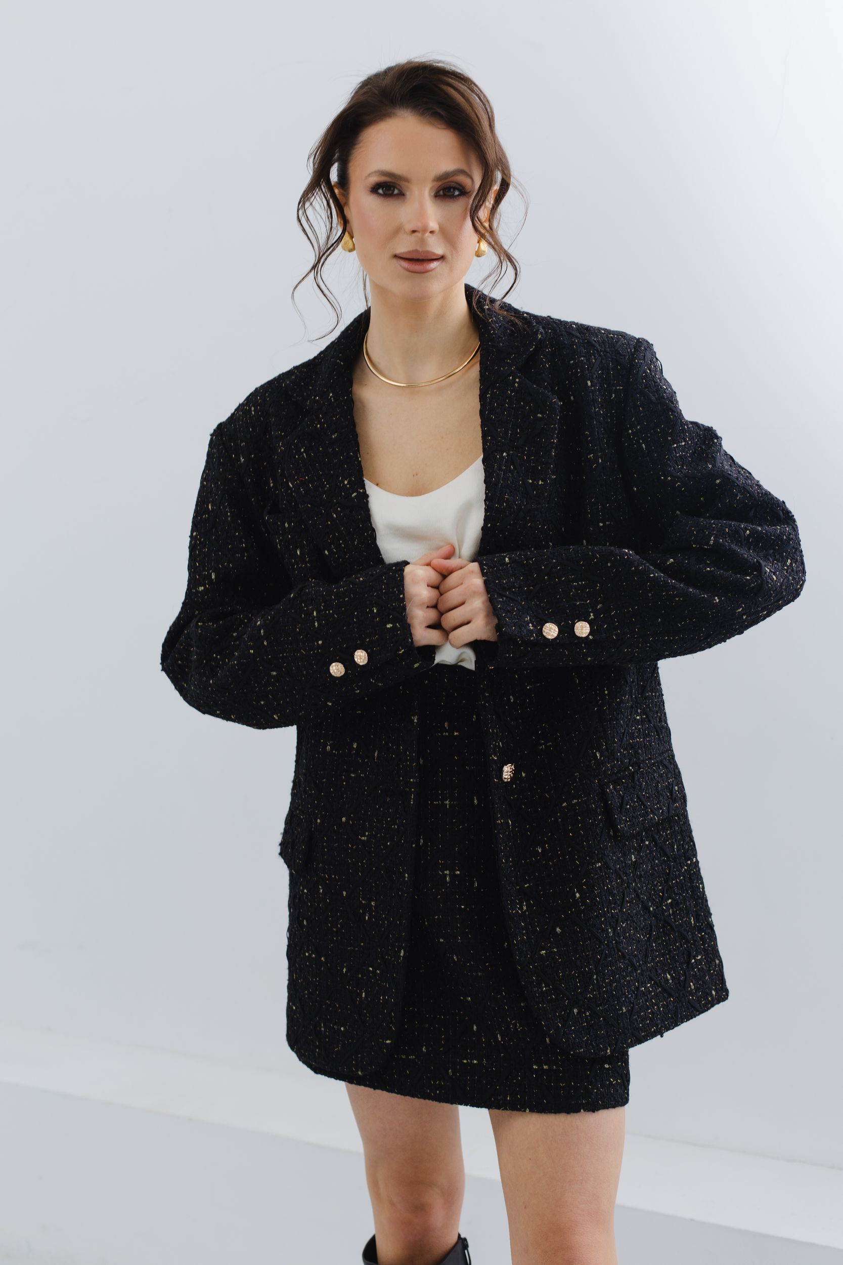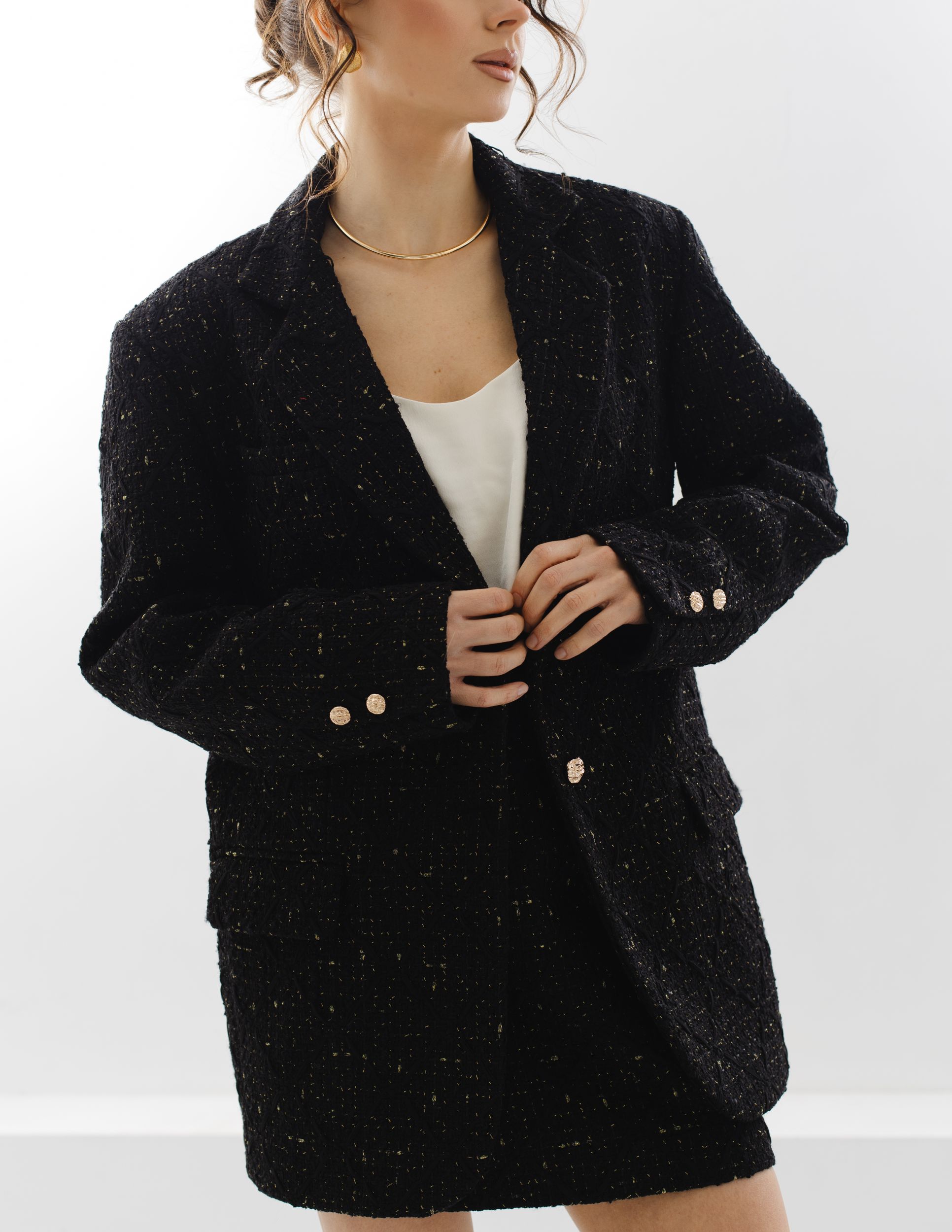 Юбка мини из черного твида с вкраплениями золотых нитей.