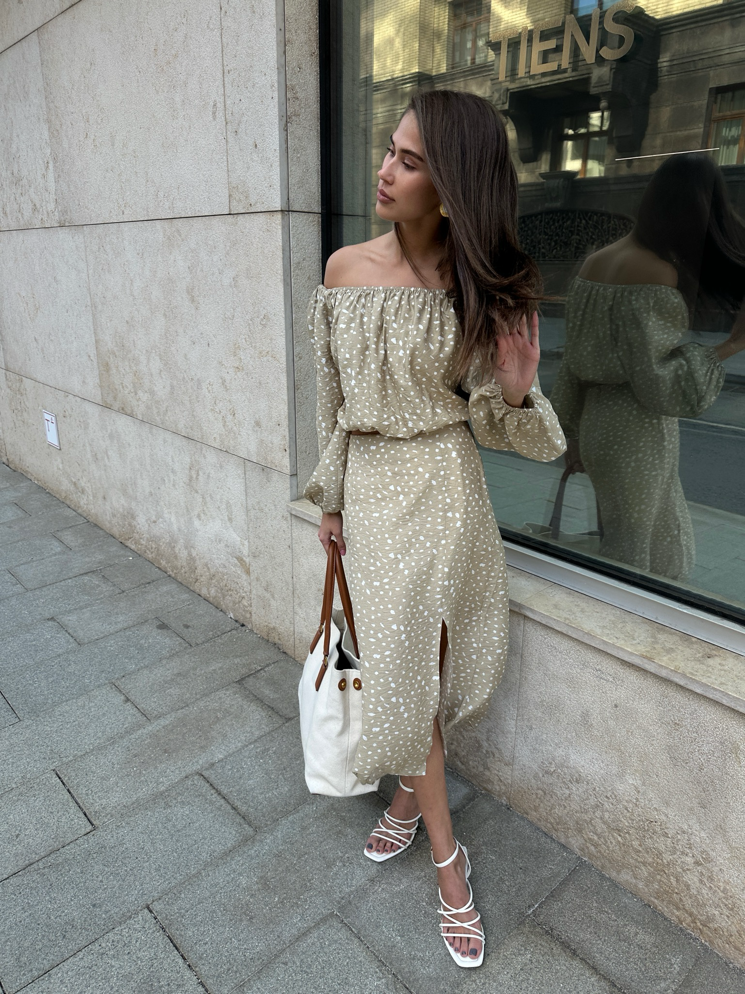 Легкая юбка из бежевой вискозы в пятнышко станет отличным элементом гардероба в жаркие, летние дни.