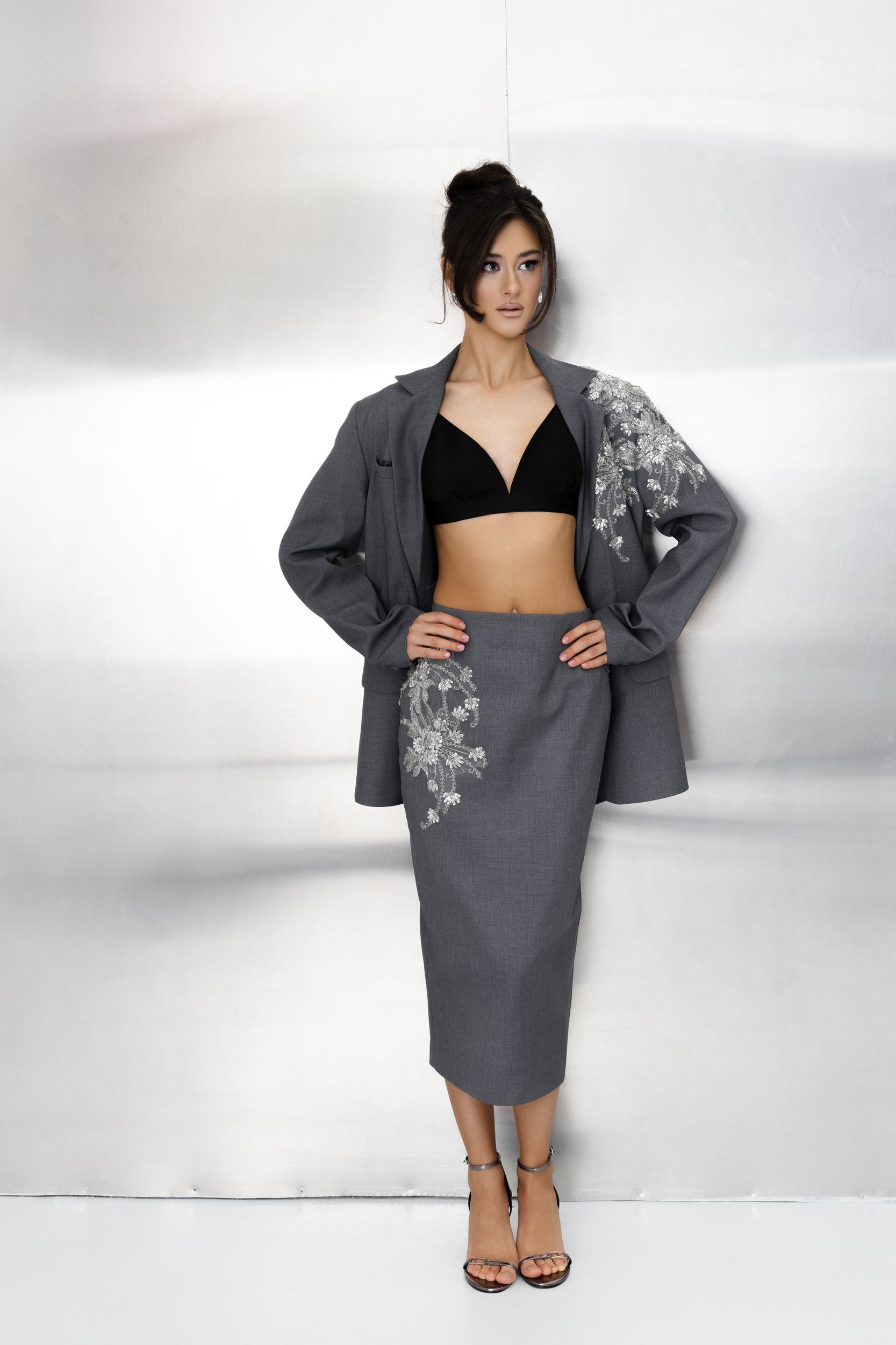 Однобортный жакет в сером оттенке с акцентной аппликацией на плече.